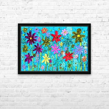 Get this artwork "Abstract Vibrant Floral Display on a Blue Background" in a framed print.