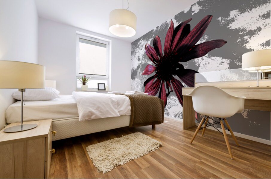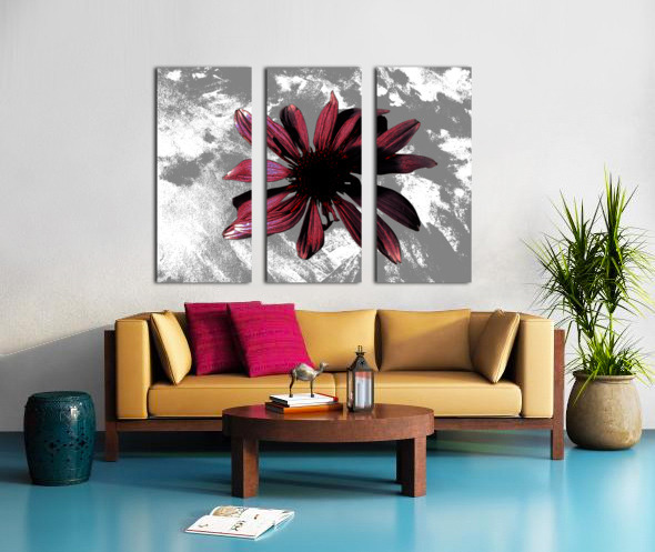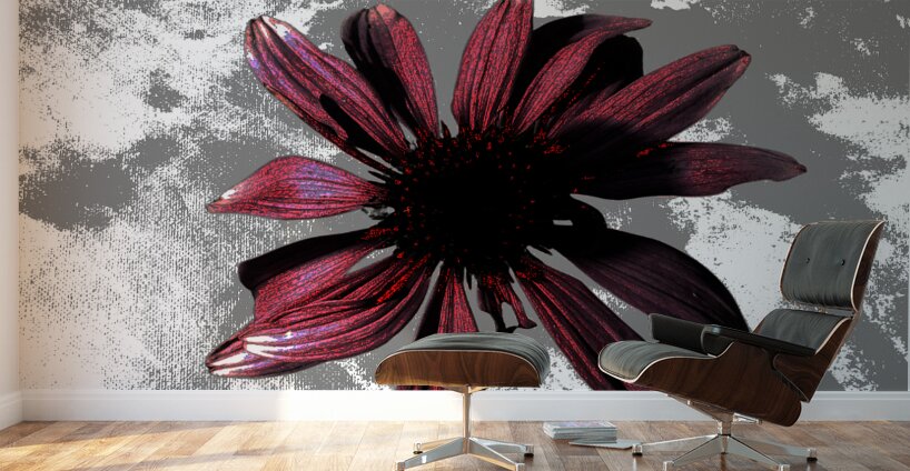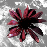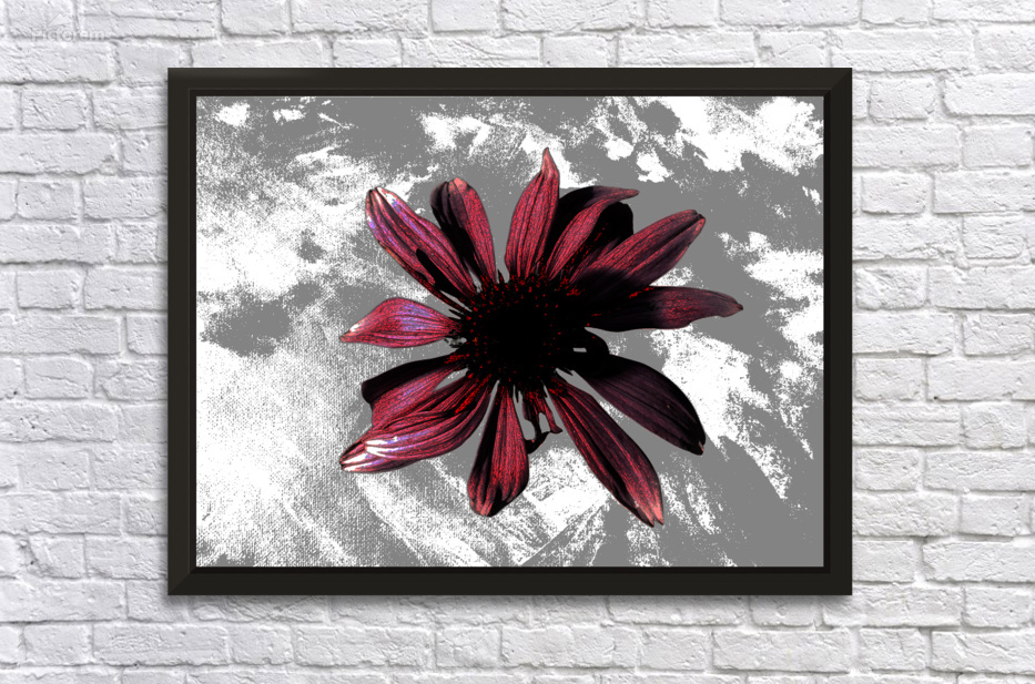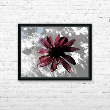 Once a hand painted acrylic and a close up photo of a Cone flower. Laterally digitally manipulated and combined using various means ( including the use of the Background Remover, layering and colour filter options in Canva.com) enabled this striking floral design to emerge. Features a striking digital depiction of a flower set against a textured grey background, with vivid maroon and black tones highlighting its petals. The combination of colors and the sharp contrast with the background gives the piece a dramatic and modern feel.
