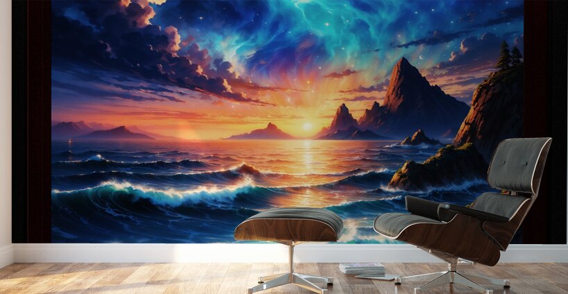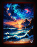 Vivid hues of blue and orange fill the sky as the sunset casts a warm glow over a turbulent sea with cresting waves. Jagged cliffs rise sharply against a backdrop of dramatic clouds that merge into a cosmic display of stars and nebulae. Read The Story At: https://xzendor7.com/stunning-ocean-sunset-and-aurora-borealis-by-xzendor7/