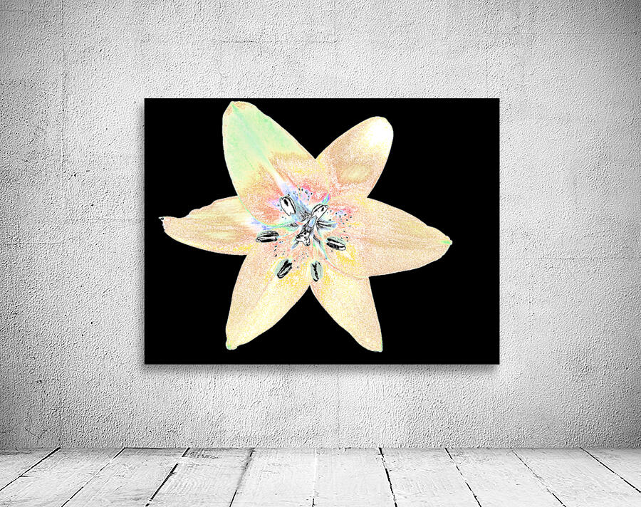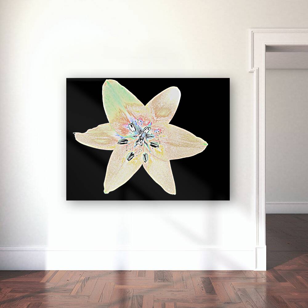 Originally a hand painted acrylic and a close up photo of a Lily flower. Laterally these were combined and digitally manipulated using various means ( including the Magic Background Remover, layering and colour filter functions in Canva.com) enabled this stunning floral digital art piece to emerge. Features a single Lily flower which takes centre stage in the composition. It's delicate petals are set against a dark abstract backdrop. The petals are stylized with subtle grading of colour, with hints of yellow, pink and green on them .