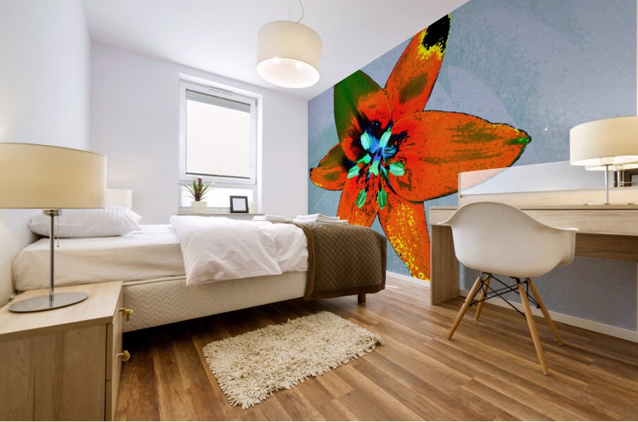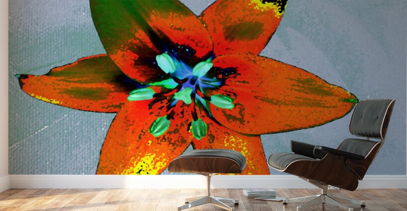 Originally a hand painted acrylic and a close up photo of a Lily flower. Laterally digitally combined and manipulated using various means (including the Magic Background Remover, layering and colour filter functions in Canva.com) enabled this dramatic piece of floral digital art to emerge. Features a single vibrant red Lily flower with a vivid blue middle heavily contrasting against a textured abstract backdrop . The Lily flower's enhanced petal colours, display green and yellow hues creating a dynamic design.