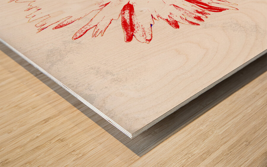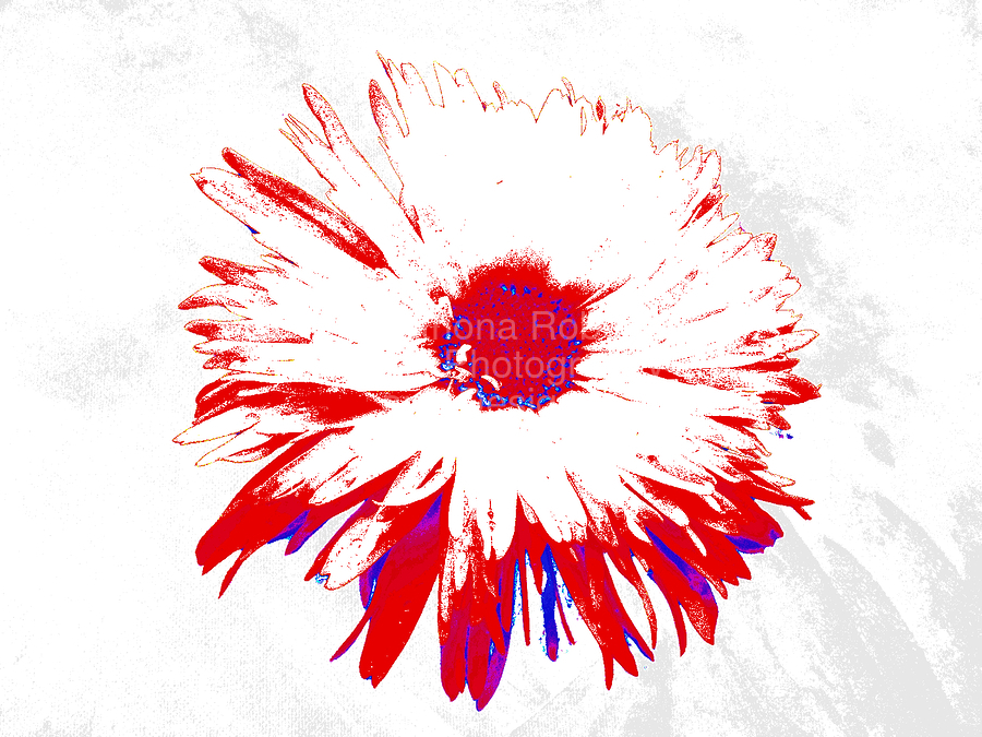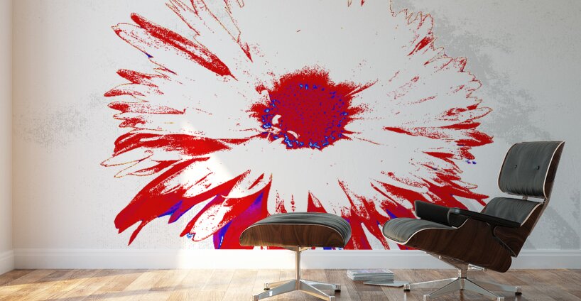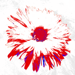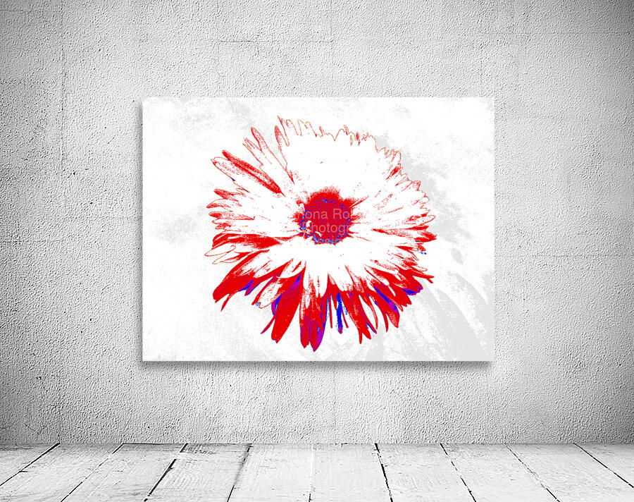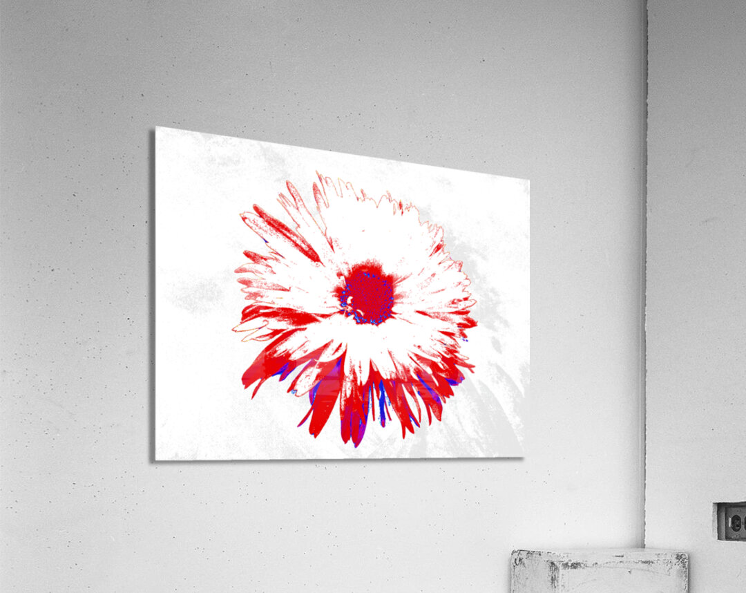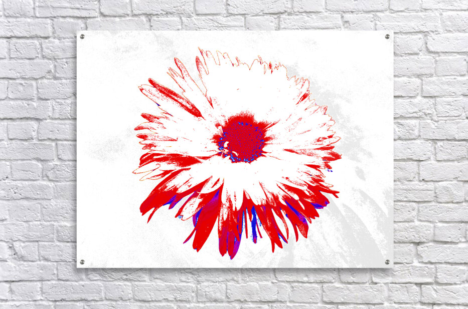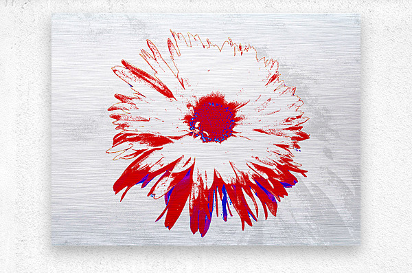 Originally a hand painted acrylic and a close up photo of a Daisy flower. Laterally digitally manipulated using various means (including the Magic Background Remover, layering and colour filter functions in Canva.com) enabled this stunning art work to emerge. Features brightly colored flower depicted with a vivid contrast of red and blue hues against a textured grey background. The digital manipulation has created a painted effect, enhancing the flower's petals with a glowing outline.