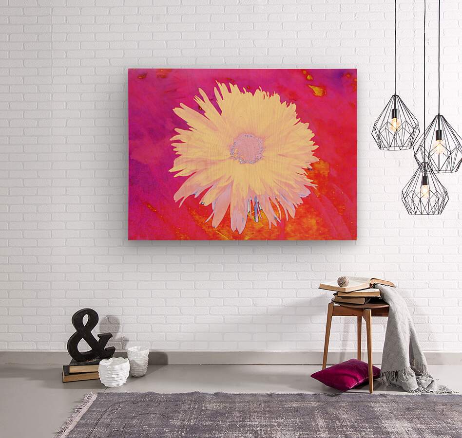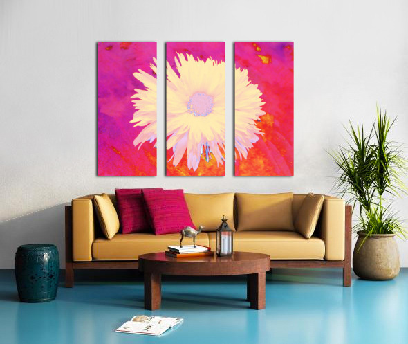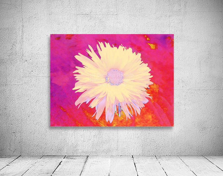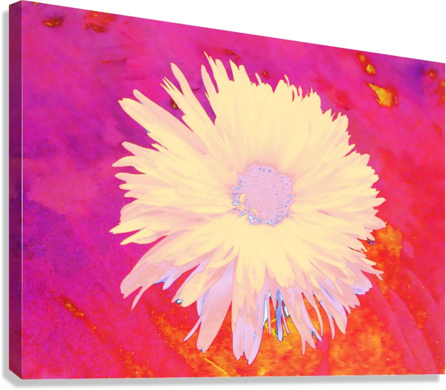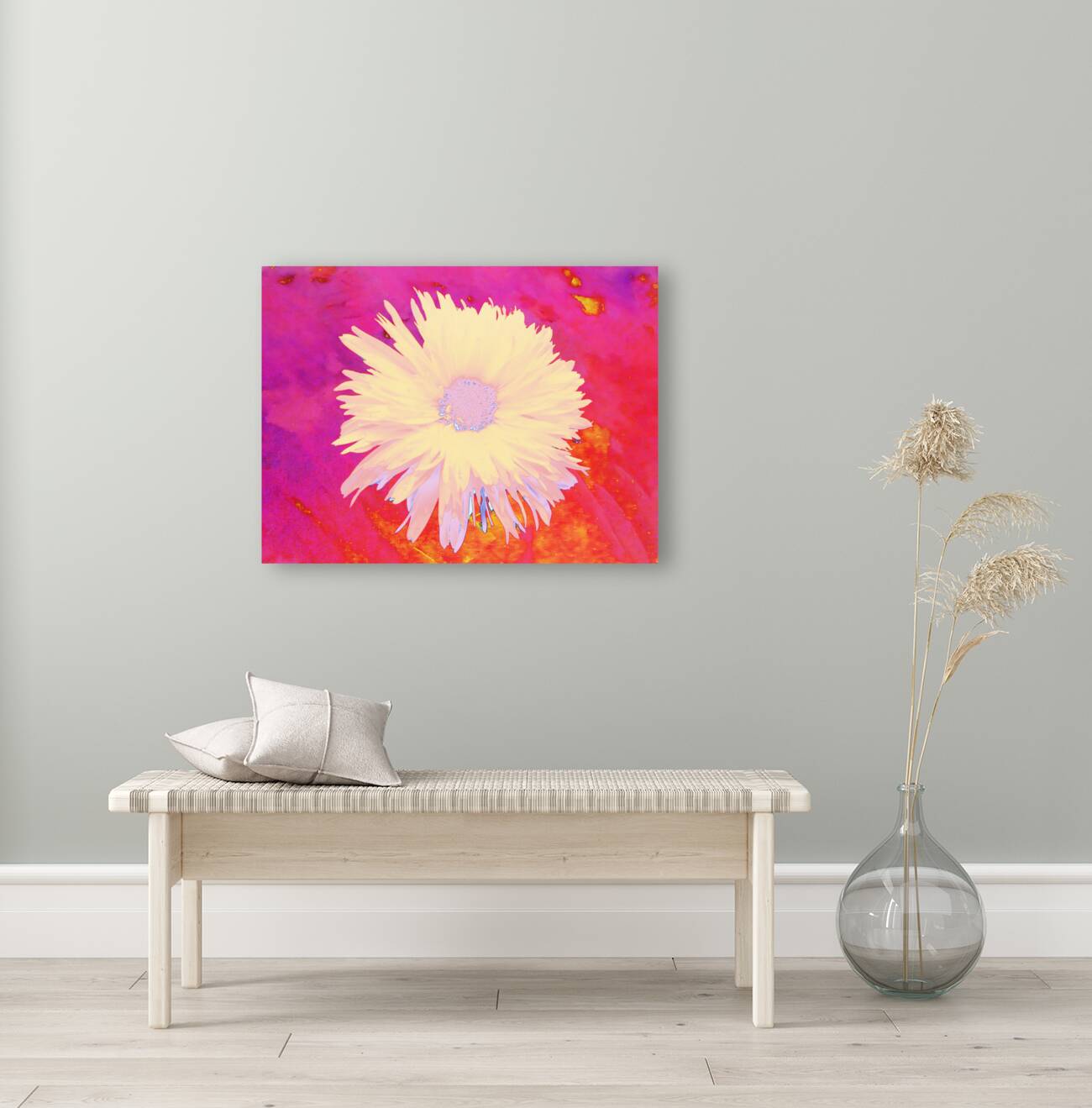 Once a hand painted acrylic and a close up photo of a Daisy flower. Laterally digitally manipulated using various means ( including the Magic Background Remover, layering and colour filter functions in Canva.com) enabled this distinctive abstract floral piece to emerge. Features a bold yellow Daisy flower set against a textured red and purple backdrop. The Daisy has an almost sunburst pattern emanating from it's middle with gentle and delicate petals.