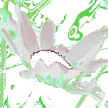 Originally a close up photo of a Daisy flower laterally digitally manipulated using an artistic filter. Features a stylized representation of a Daisy flower standing proud in middle of the composition, surrounded by green abstract lines that create a vivid, almost map-like background. The flower's petals are colorized with soft white and shades of green, adding to the dreamlike aesthetic of the digital manipulation.