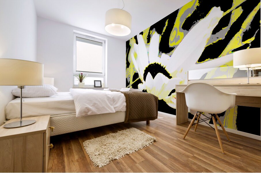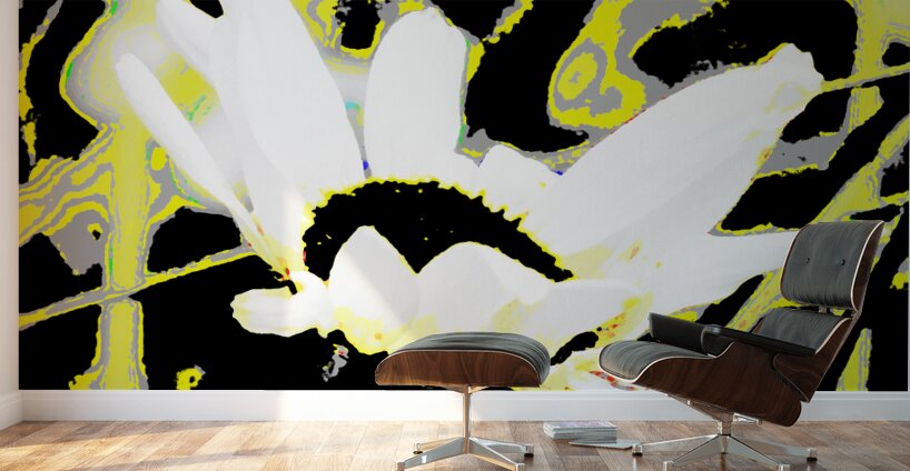 Originally a close up photo of a Daisy flower laterally digitally manipulated into a heavily stylized design showing a Daisy with its white petals and yellow center prominently displayed. The background is abstract with swirls and a mix of dark and light areas enhancing the contrast of the flower.