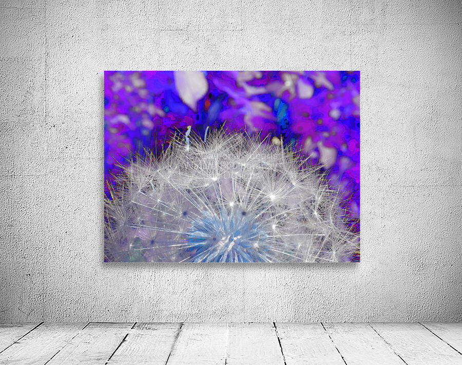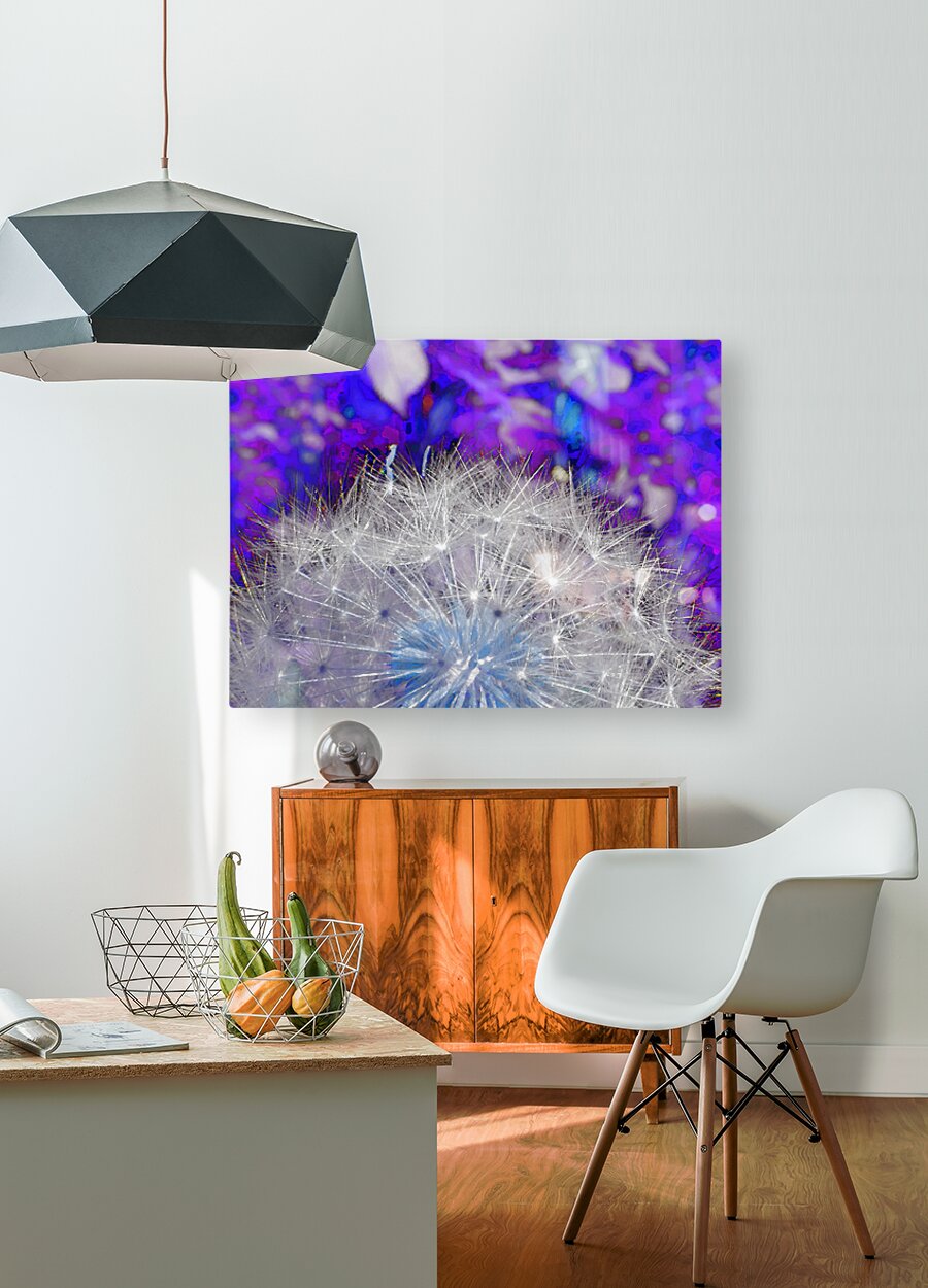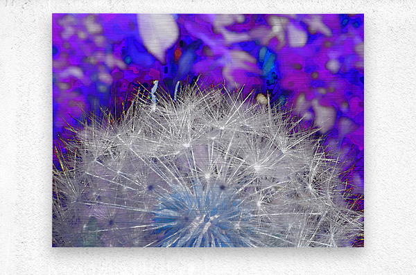 Originally a close-up photo of Dandelion seed heads . Laterally digitally manipulated to create vivid and surreal colors, primarily in shades of blue and purple. The intricate details of the seeds stand out against an abstract, colorful background.