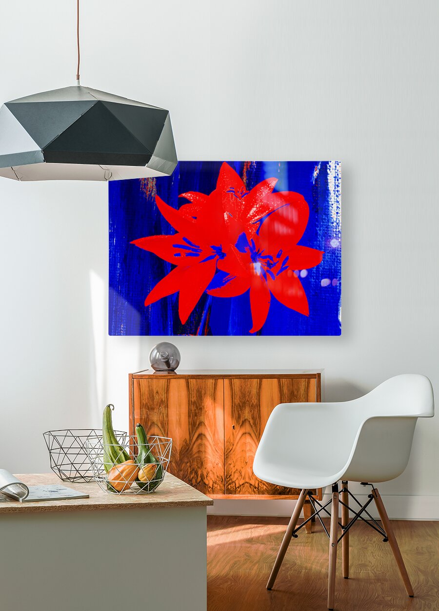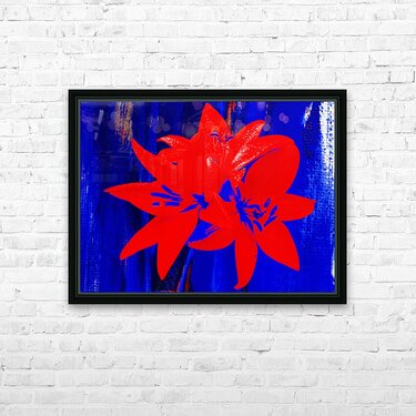 Originally a hand painted acrylic and a close up photo of Lily flowers, laterally digitally combined and manipulated into an unique piece of floral contemporary art. Features bright red flowers which stand out against a vibrant, abstract blue background. The petals are detailed and contrasted sharply with the deep hues behind them.