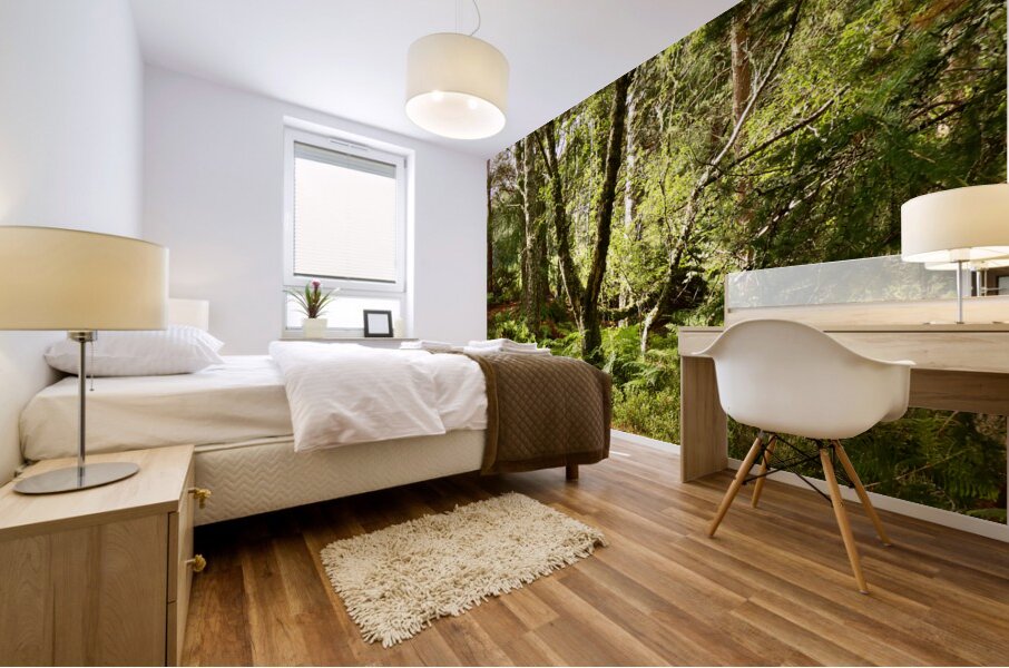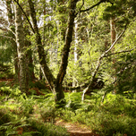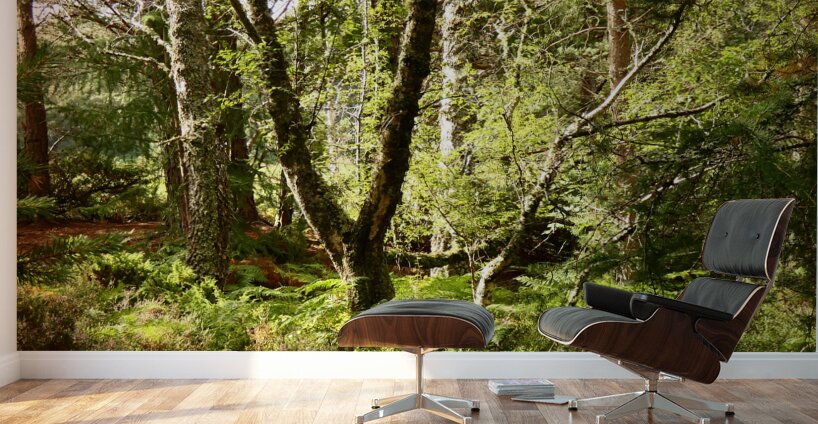 A coloured photography featuring a lovely nature walk in the Scottish Highlands. Sunlight filters through the dense canopy, illuminating the lush gree...[+]