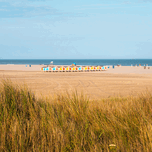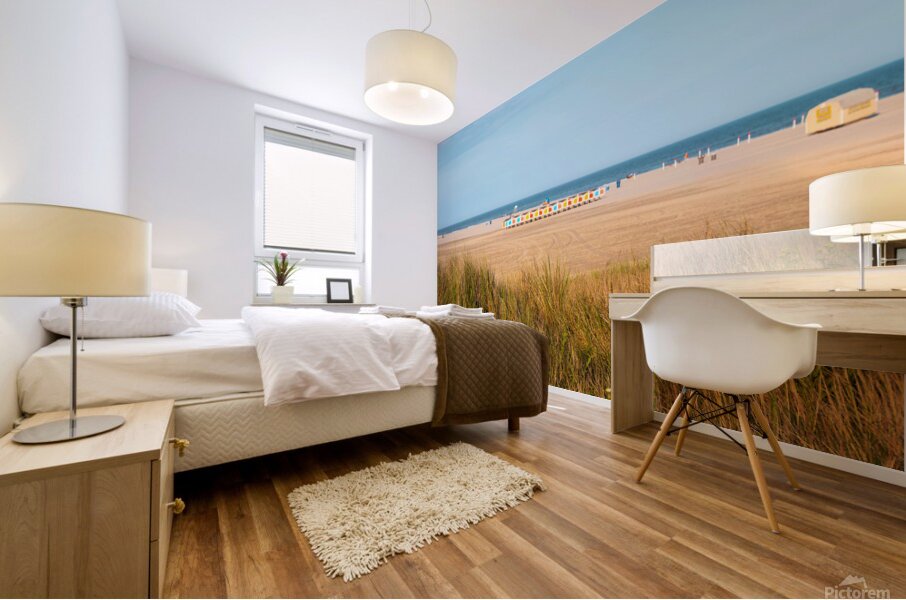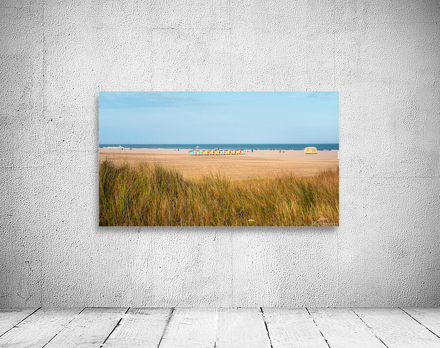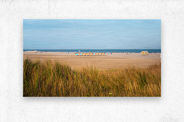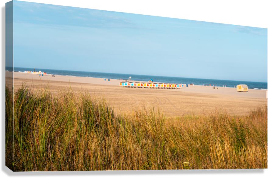 Grassy dunes lead to a sandy beach where colorful beach huts are lined up along the shore. The calm sea stretches out under a clear blue sky in the ba...[+]