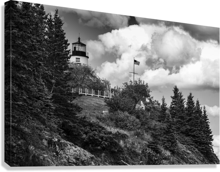 OWLS HEAD LIGHT OVER ROCKY CLIFFS IN MIDCOAST MAINE - B&W ALLAN WOOD  Canvas Print