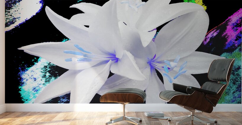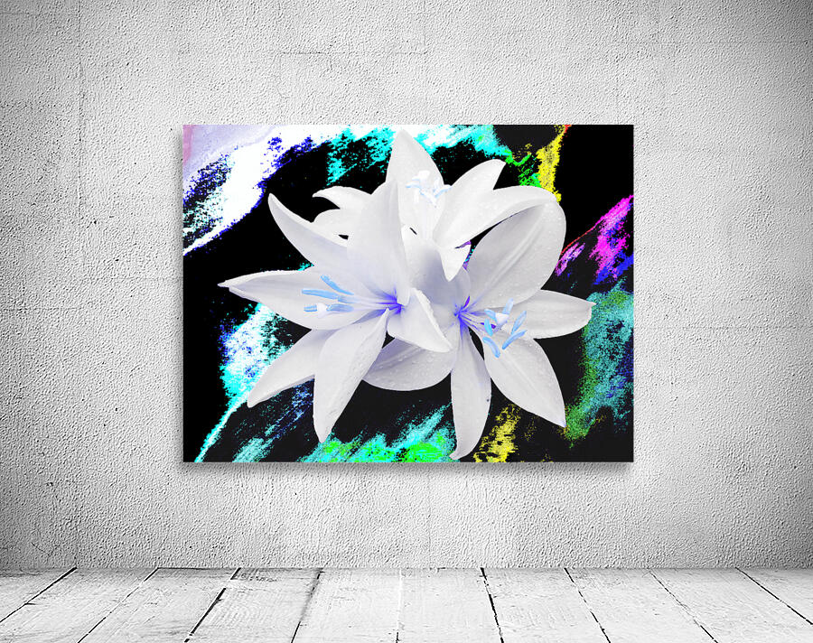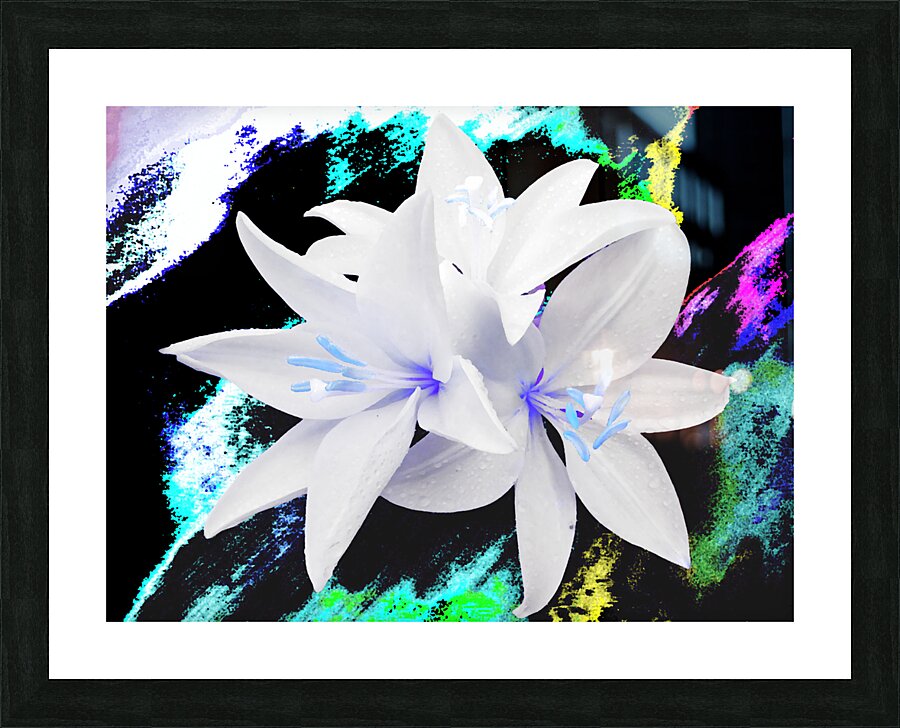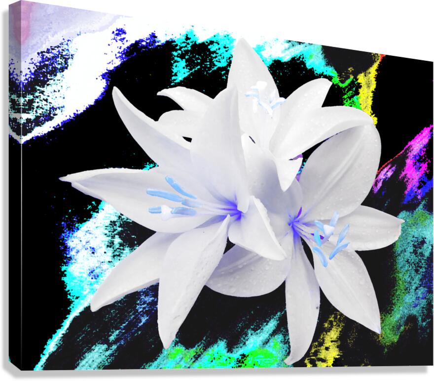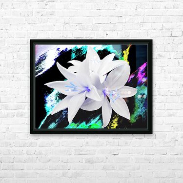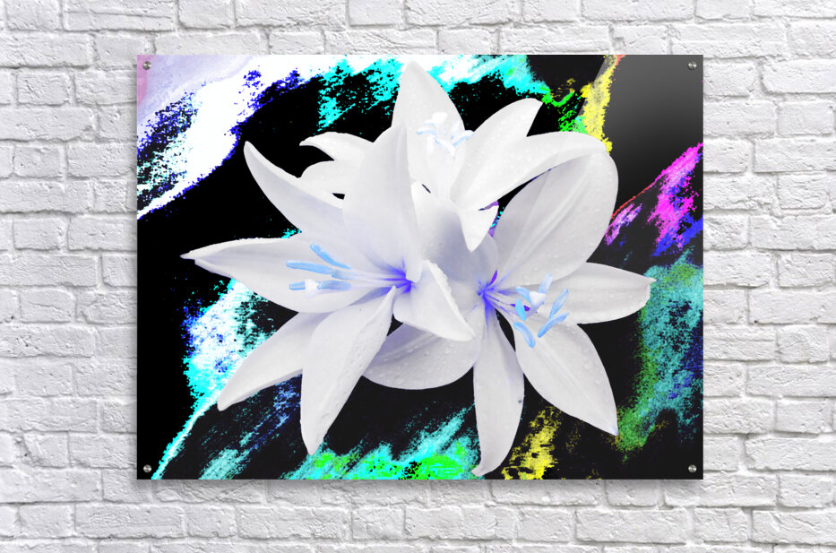 Originally hand painted acrylic and a close up photo of Lily flowers. Laterally digitally combined and manipulated using various means (including the use of the Magic Grab, layering and colour filter options within Canva.com). Features a trio of white Lily flowers with prominent blue stamens which stand out against a vibrant and abstract multicolored background. The contrast between the delicate petals and the energetic backdrop creates a striking visual effect.