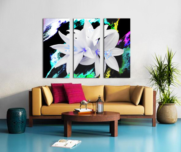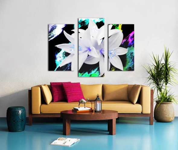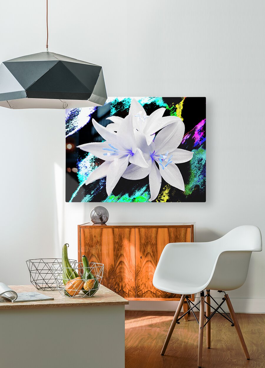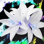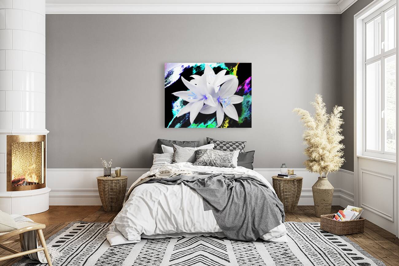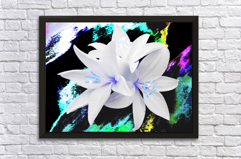 Originally hand painted acrylic and a close up photo of Lily flowers. Laterally digitally combined and manipulated using various means (including the use of the Magic Grab, layering and colour filter options within Canva.com). Features a trio of white Lily flowers with prominent blue stamens which stand out against a vibrant and abstract multicolored background. The contrast between the delicate petals and the energetic backdrop creates a striking visual effect.