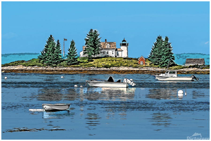Boats Anchored by Pumpkin Island Light in Maine - Illus. Picture Frame Printing