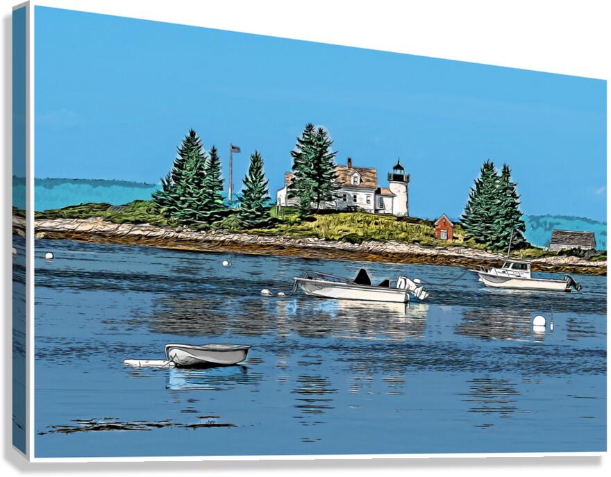 BOATS ANCHORED BY PUMPKIN ISLAND LIGHT IN MAINE - ILLUS. ALLAN WOOD  Canvas Print