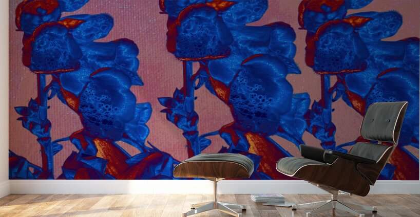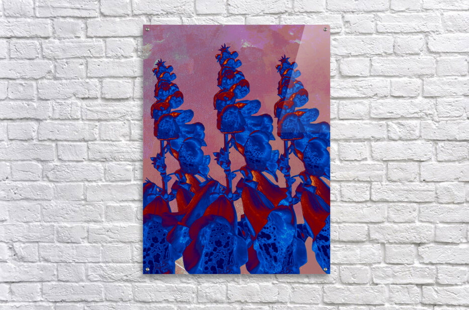 Once a hand painted acrylic and a close up photo of a Foxglove. Laterally digitally combined and manipulated using various means ( including the use of the Magic Grab, layering and colour filter options in Canva.com). Features bright blue Foxgloves standing tall against a warm, abstract background. The contrasting colors create a vibrant and surreal effect.