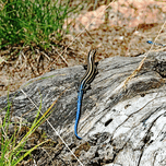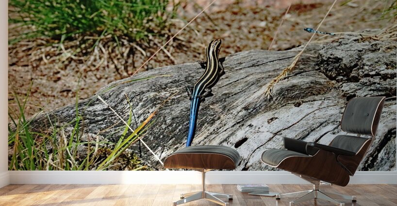 "Lizard And Dragonfly" by Debbie Oppermann. Super thrilled to see this unique and only lizard of Ontario and the bonus was having a blue Dragonfly flying near the skink. The Five Lined Skink is a small lizard with vibrant blue stripes so it is a juvenile and it is classed as an endangered species/species at risk in Ontario. It is perched on a weathered tree root, surrounded by green grass and dry soil. The scene captures a natural habitat, highlighting both the reptile and its immediate environment. The five-lined skink (Plestiodon fasciatus) is Ontario’s only native species of lizard. The five-lined skink is a smooth, slender lizard that can grow 14 to 19 centimetres in length. Their coloration varies with age. Juveniles and young adult females are glossy black with five cream stripes down the back and a bright blue or blue-grey tail. Males and older females gradually fade to a more uniform bronze, although often the stripes are still visible. Males in breeding condition have a bright orange chin and jaw. Five-lined skinks are not territorial, and individuals do not have strict home ranges. These lizards eat a wide variety of invertebrates, such as insects, spiders and worms, and track prey with their keen sense of smell. On cool sunny mornings, five-lined skinks can be seen basking in the sun, but most often they are found hiding under cover. They typically hunt in leaf litter and woody debris. They will also climb trees to hunt, bask or escape predators. If a predator catches a skink by the tail, it will break off and begin to thrash about. The moving tail distracts the predator while the lizard escapes. Although a new tail will grow over time, the skink will have lost much of the fat reserves on which it relies to survive the winter.