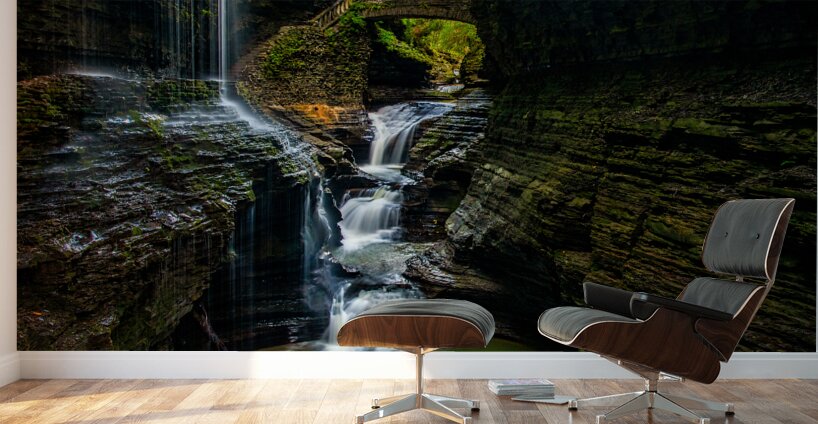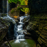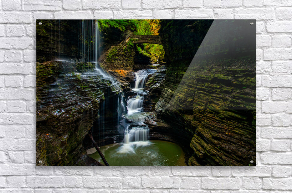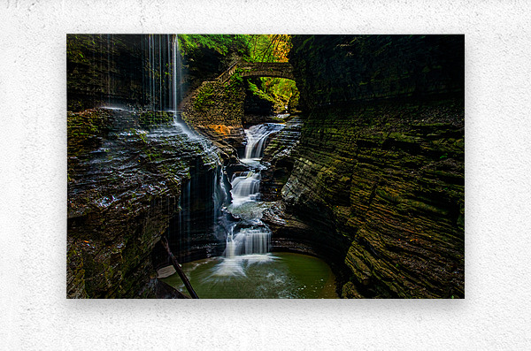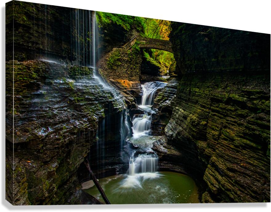 The view of Watkins Glens Rainbow Falls in Upstate New York is simply stunning. The veiled waterfall on the left allows visitors to Watkins Glen State Park to walk behind it and see rainbows during sunny afternoons and the scene is complimented by the tiered waterfall under a stone footbridge. Watkins Glen Gorge is formed by Glen Creek which empties into Seneca Lake one of the regions five fingerlakes. The state parks Gorge Trail is just 2 miles long but the scenery is amazing. Prints of this amazing photo are available as archival prints metal prints canvas gallery wraps and acrylic prints.