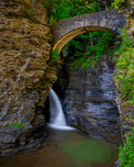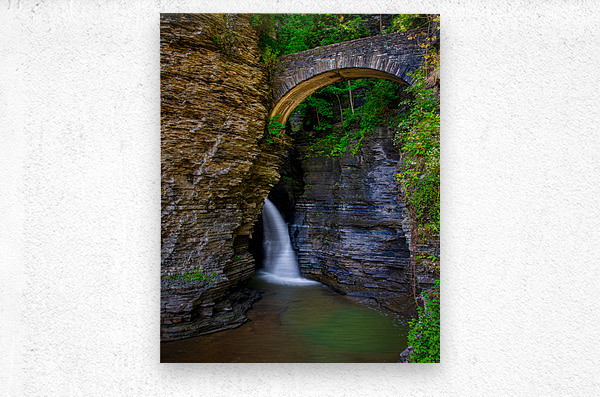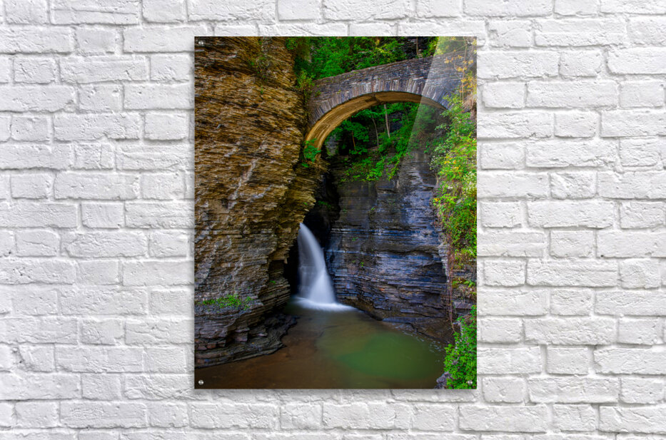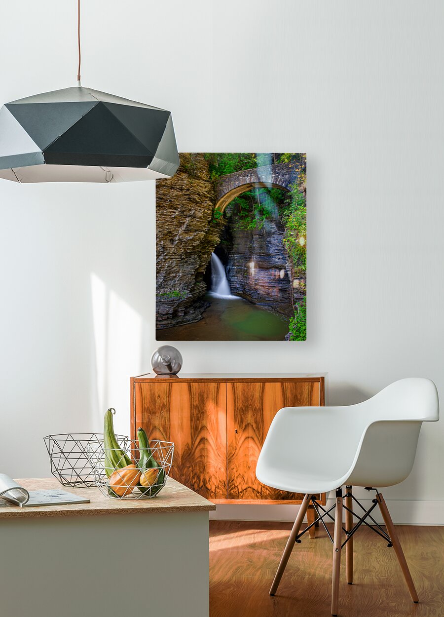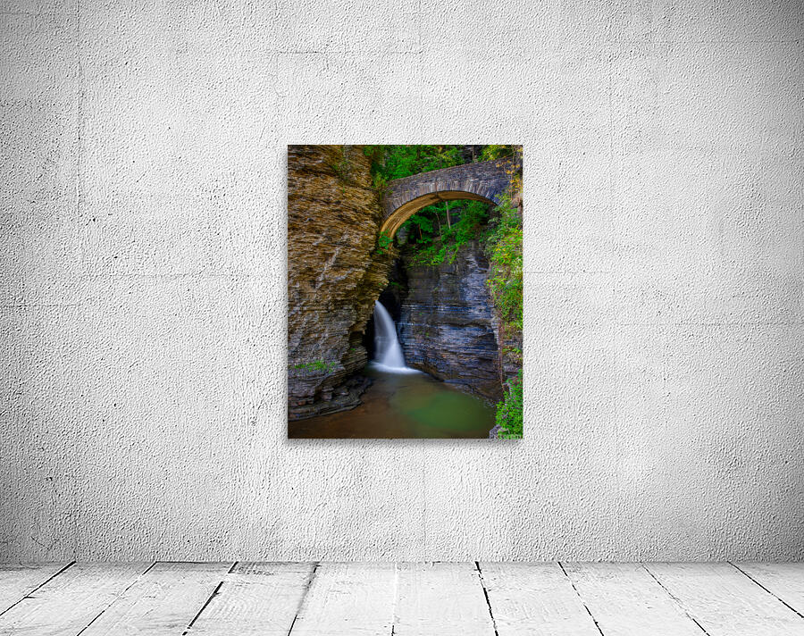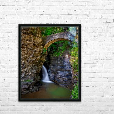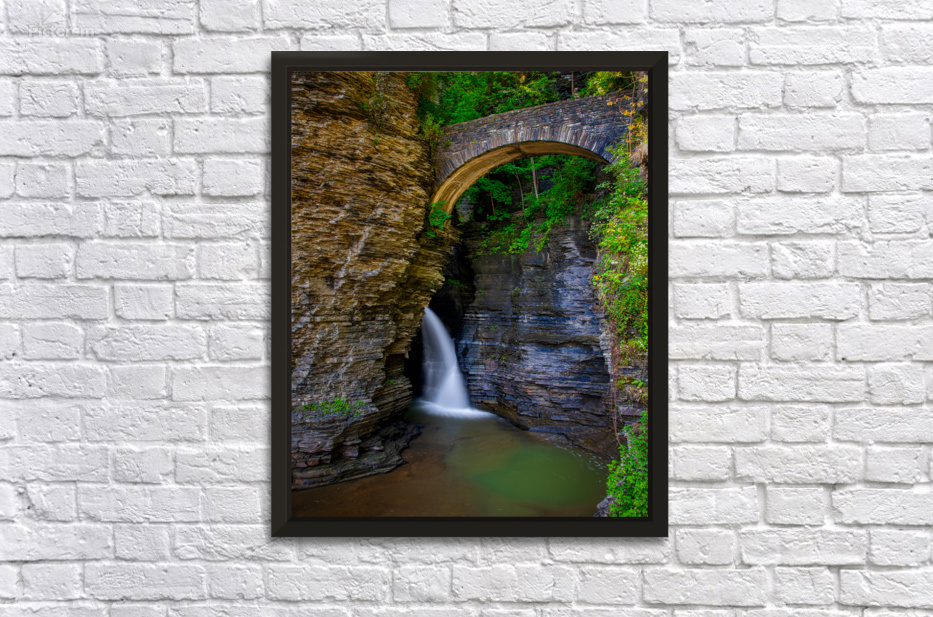 Get this artwork "Watkins Glen Suspension Bridge cascade" in a framed print.
