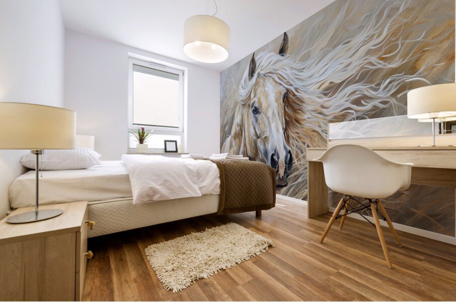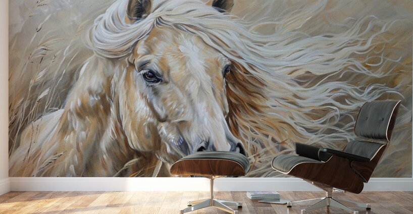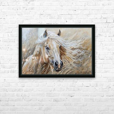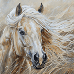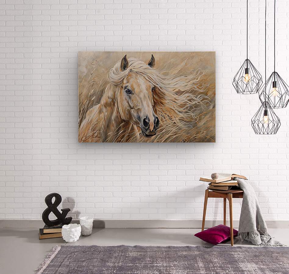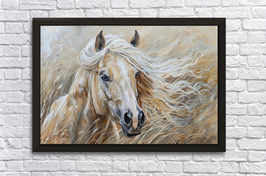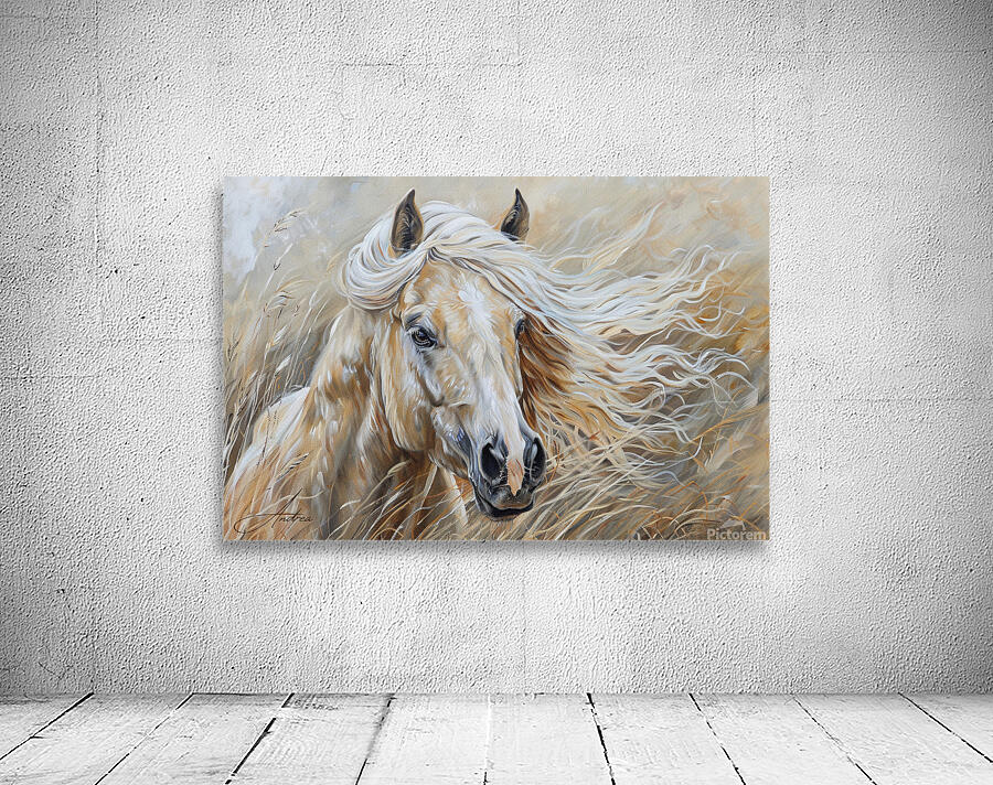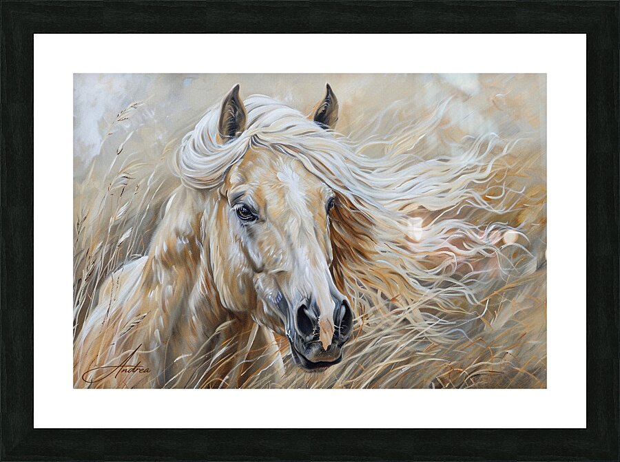 Sassafras was carried by the Notos wind, and her expression gives the impression it was a glorious flight. Her fluffed up, golden palomino coat and trailing mane capture the warm air of the season.. you can almost smell the grassy fields around her! Her wild spirit and joy are the essence of this painting. Sassafras will suit any living room, bedroom, office or barn beautifully! Digitally created by Andrea Record these fine art prints will delight all horse and Yellowstone lovers, and spaces looking to bring nature into them.. An earth-tone painting that looks great in all mediums. Wood prints will read a little darker.