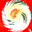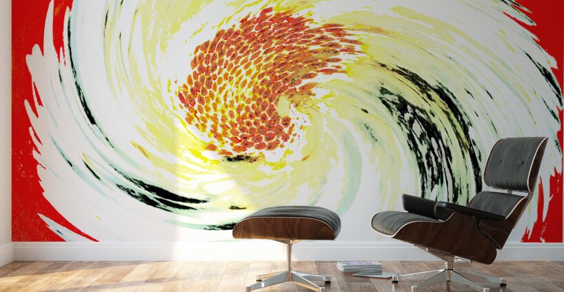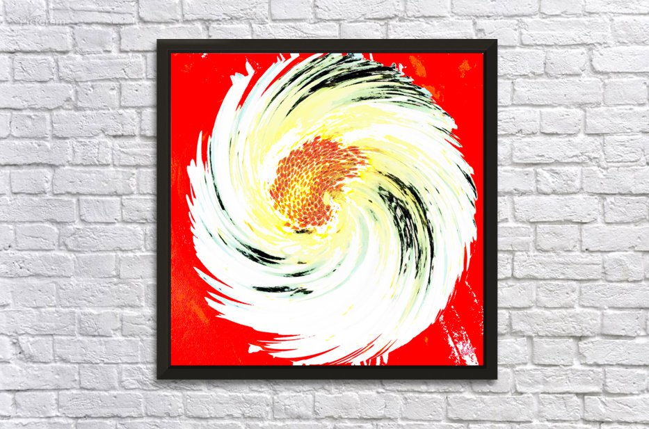 Originally a hand painted acrylic and a close up photo of a Daisy flower. Laterally combined and digitally manipulated into a swirling pattern of white, yellow, and black colors which radiates from a red and yellow center, set against a vibrant red background. The composition creates a sense of motion and energy.