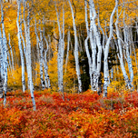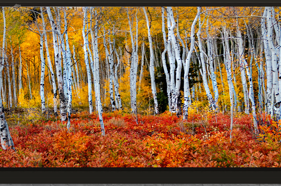 On my trip to Colorado in the San Juan National Forest, the most stunning scenes of vegetation in Autumn were the Aspen Tree groves with backlight and the red scrub oak brush on the hillsides. I was determined to find both in one photo wanting to emphasis the colors of both and found a forest near Telluride in the San Juan National Forest that showcased the wonderful Fall colors among the white Aspens. Love this one in a panorama. Multi contest winning photograph.