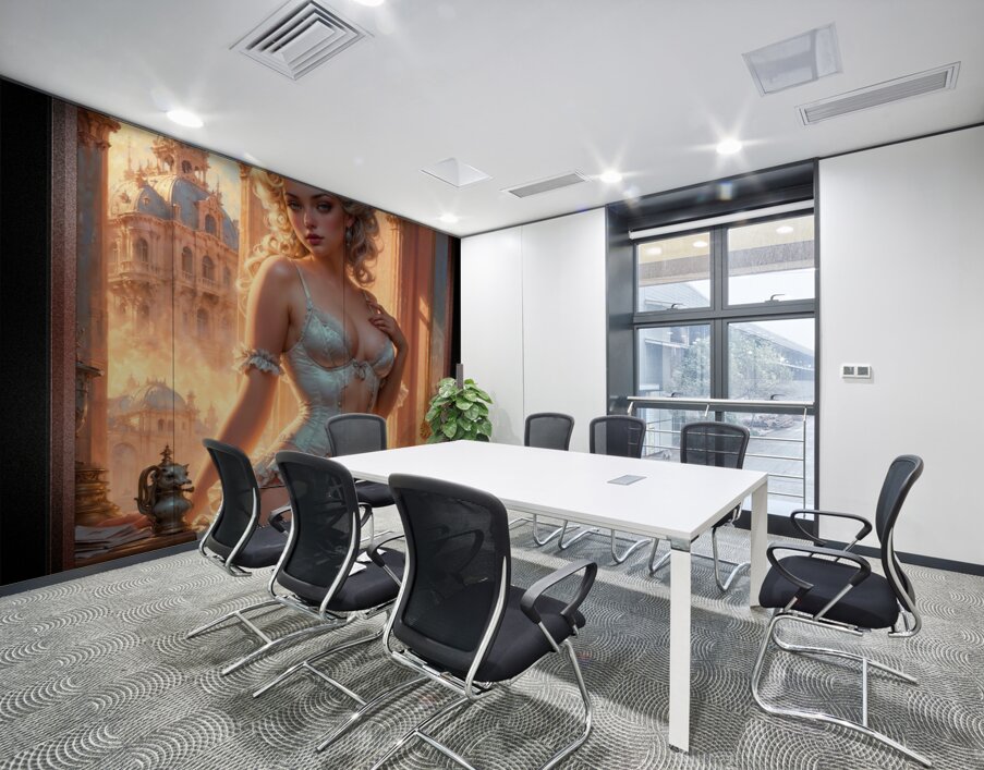 A woman wearing intricate, revealing lingerie poses elegantly in a luxurious room adorned with Baroque architectural elements. Sunlight illuminates th...[+]