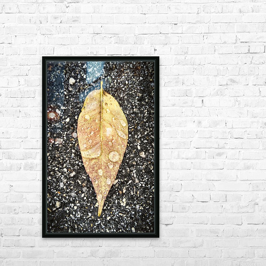 "Nature's Jewelry on a Rainy Day" captures a single leaf adorned with water droplets. The leaf, elongated and pointed at both ends, transitions in color from golden yellow to reddish-brown, reflecting the autumn season. Water droplets scattered across the leaf catch the light, adding freshness and texture. The coarse, dark asphalt background contrasts sharply with the delicate leaf, making it the focal point. The composition highlights the intricate details and natural beauty of the subject, emphasizing realism and simplicity.