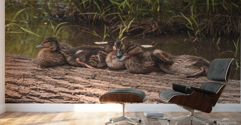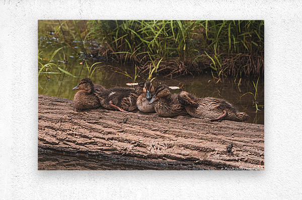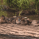 A group of mallard ducklings resting on a log near the edge of a pond surrounded by tall grass. The water is calm, and the ducklings are huddled next ...[+]