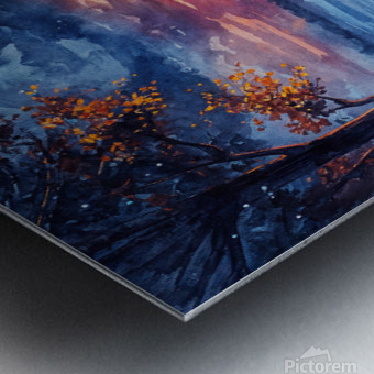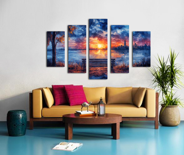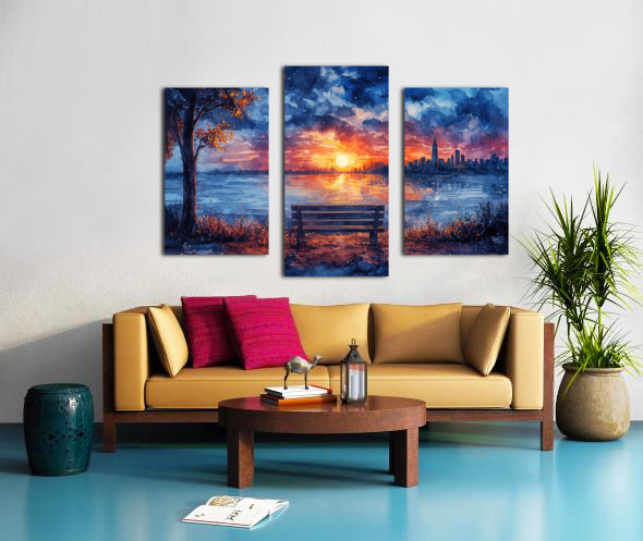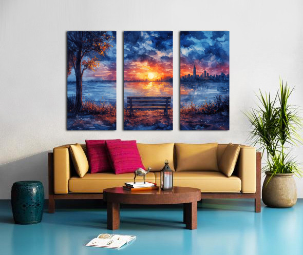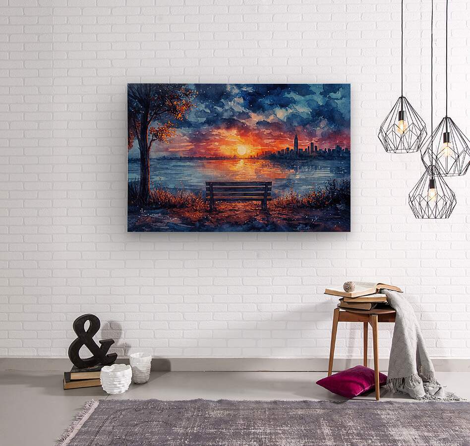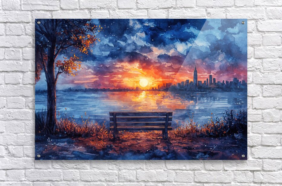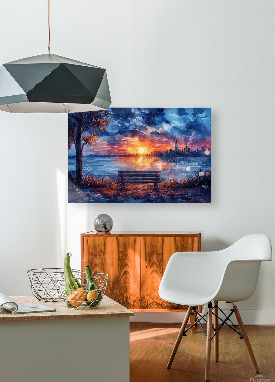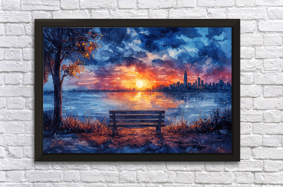 The Bench at the City's Edge - Authentic digital art by ARTenyo This digital painting represents a lone bench sits poised at the water's edge, offering a sanctuary from the bustling city life just beyond. A solitary tree stands sentinel, its branches reaching out towards a sky painted with the vibrant hues of sunset. The cityscape rises in the distance, a silhouette against the golden light, its twinkling windows like distant stars. The water below mirrors the fiery sky, reflecting the beauty of the fading day. This is a place to pause, to breathe in the serenity of the moment, and to feel the city's pulse from a distance. It’s a reminder that even amidst the concrete jungle, there are pockets of peace waiting to be discovered.