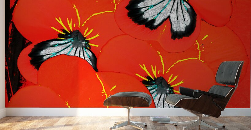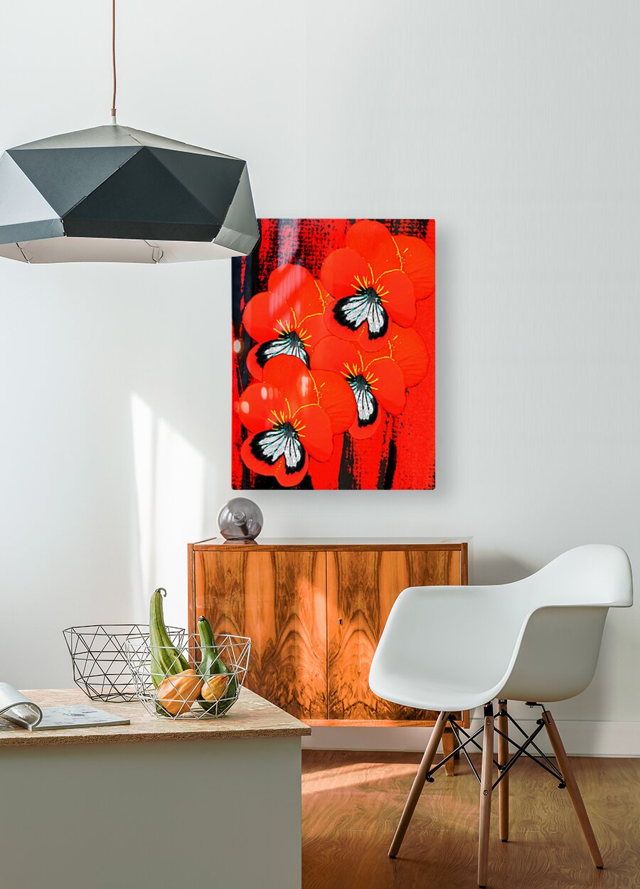 Originally a hand painted acrylic and a close up photo of a Pansy flowers, laterally digitally manipulated into a stunning mixed medium floral design. Features bright red Pansy flowers with contrasting black and white centers which dominate the composition against a rich red background with subtle black accents. The petals are detailed with fine yellow lines, enhancing the vibrant and dynamic aesthetic of the flowers.