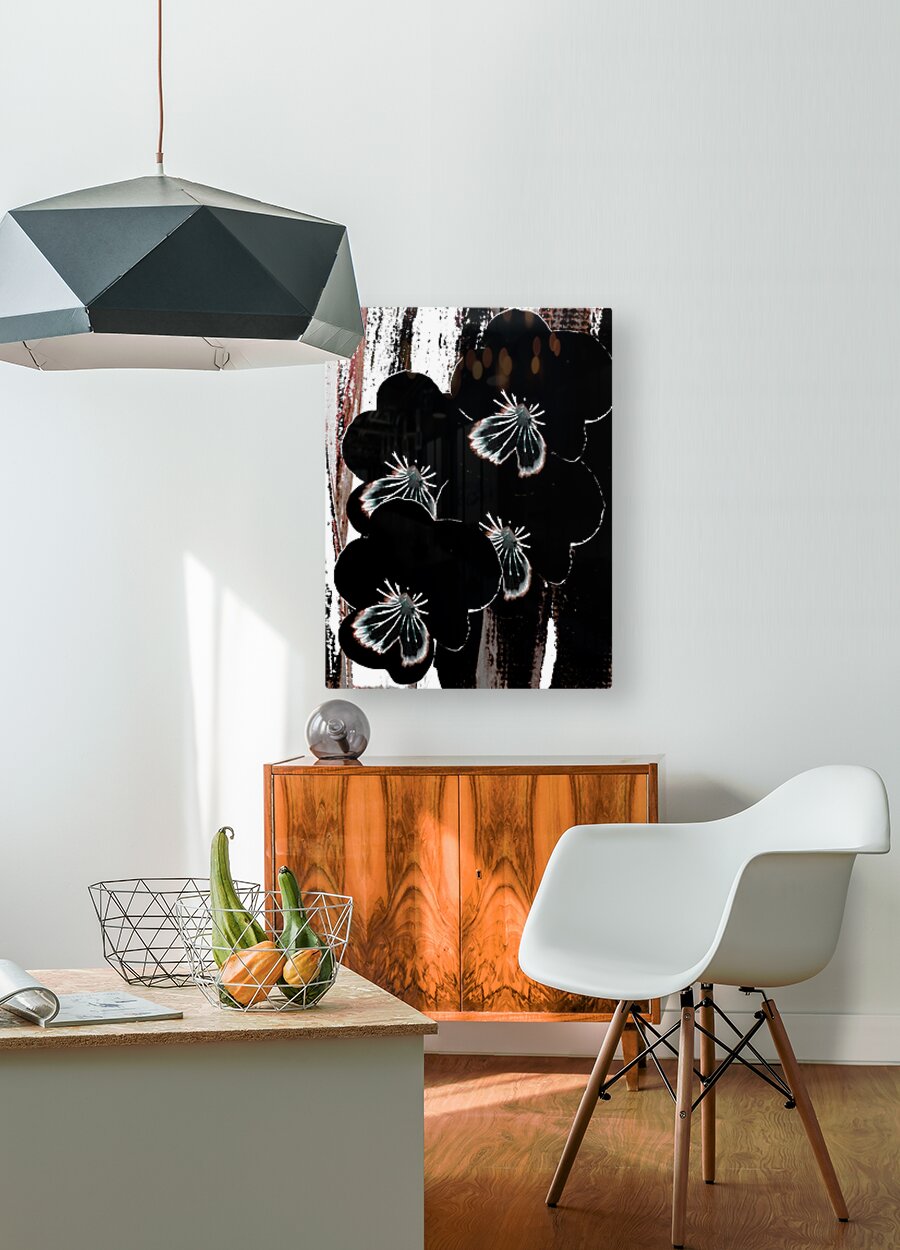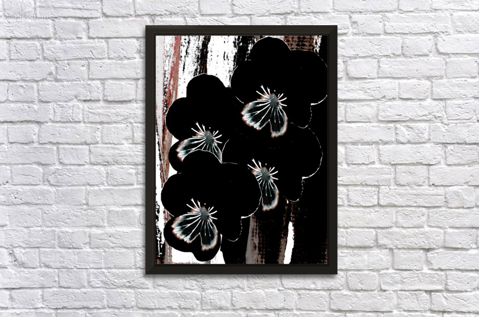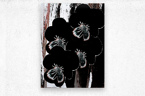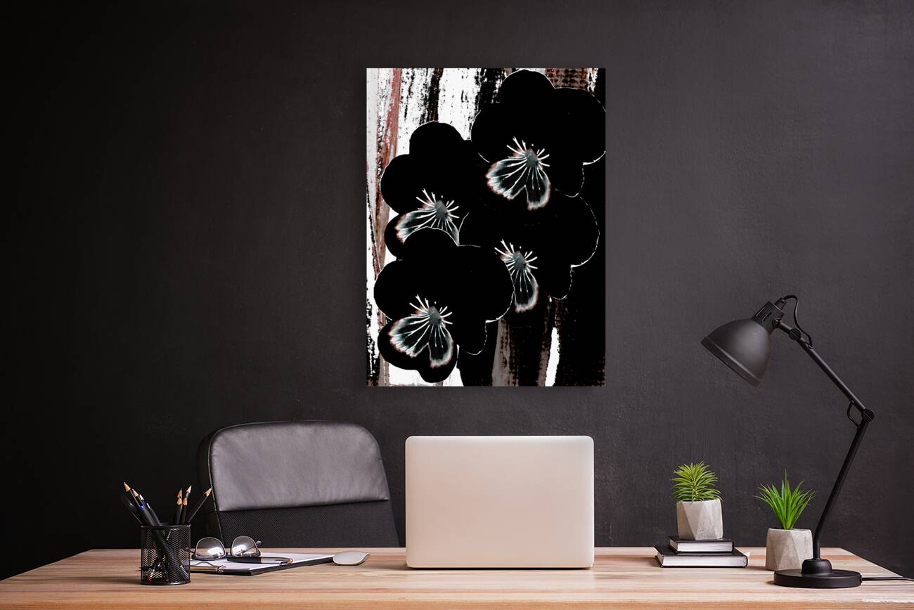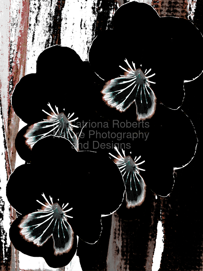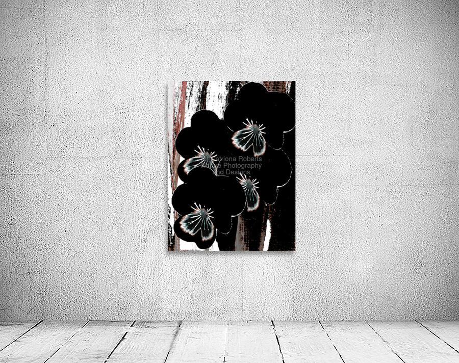 Originally a hand painted acrylic and a close up photo of Pansy flowers laterally digitally manipulated into a striking piece of floral contemporary art work . Features dark floral Pansy flowers with highlighted petals which stand out against an abstract streaked, textured, backdrop of black, white, and brown. The contrast between the floral elements and the background creates a dramatic visual effect.