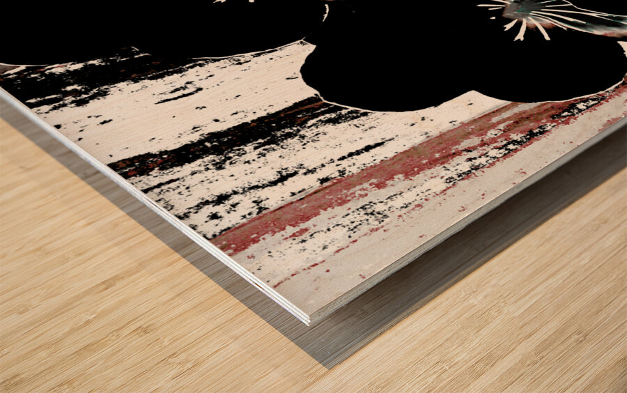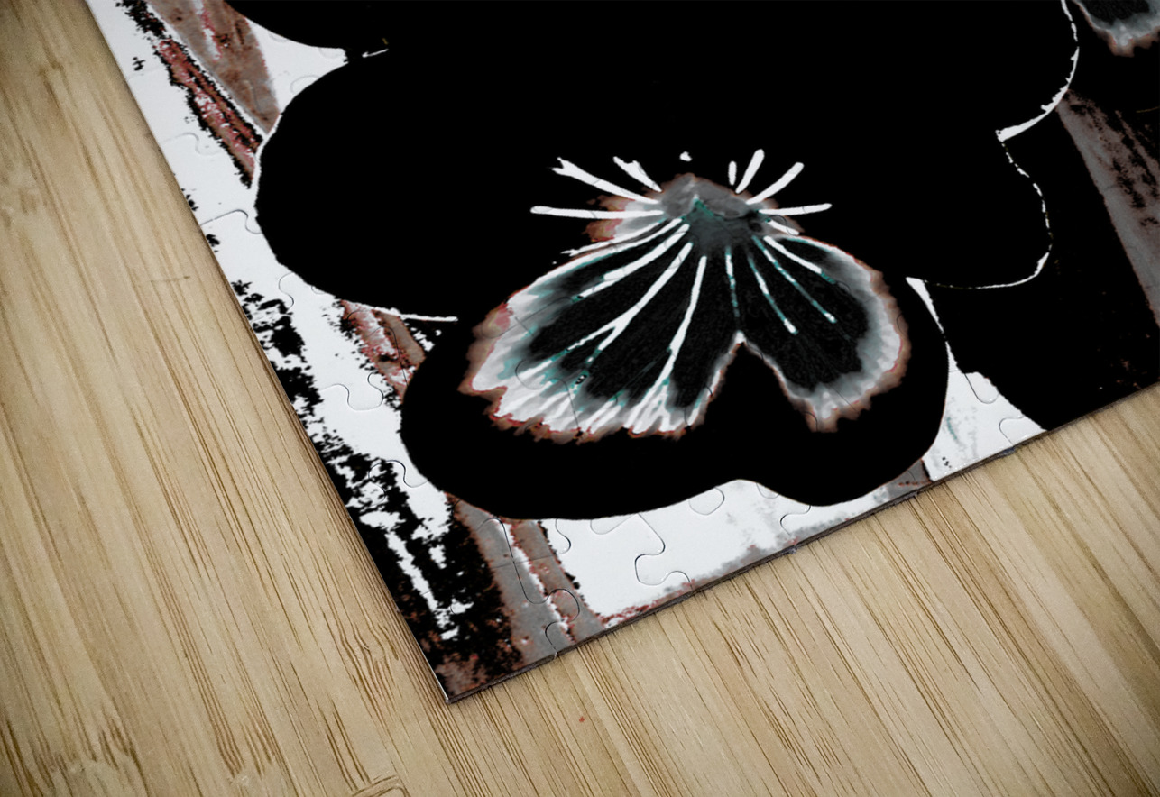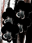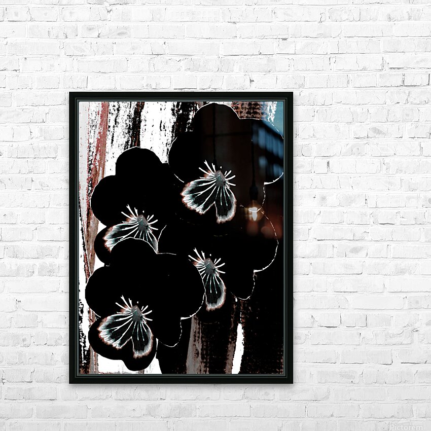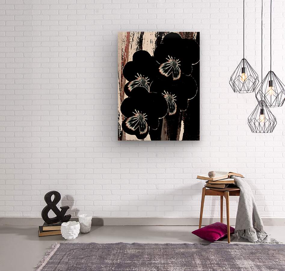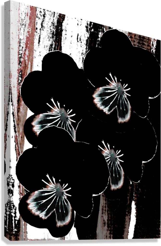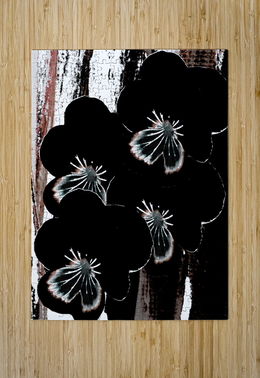 Originally a hand painted acrylic and a close up photo of Pansy flowers laterally digitally manipulated into a striking piece of floral contemporary art work . Features dark floral Pansy flowers with highlighted petals which stand out against an abstract streaked, textured, backdrop of black, white, and brown. The contrast between the floral elements and the background creates a dramatic visual effect.