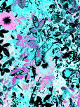 Originally a coloured photograph laterally digitally manipulated into brightly colored flowers and leaves in shades of pink, purple, and black contrast against a cyan background. The composition is vivid and gives a surreal, dreamlike quality to the natural elements depicted.