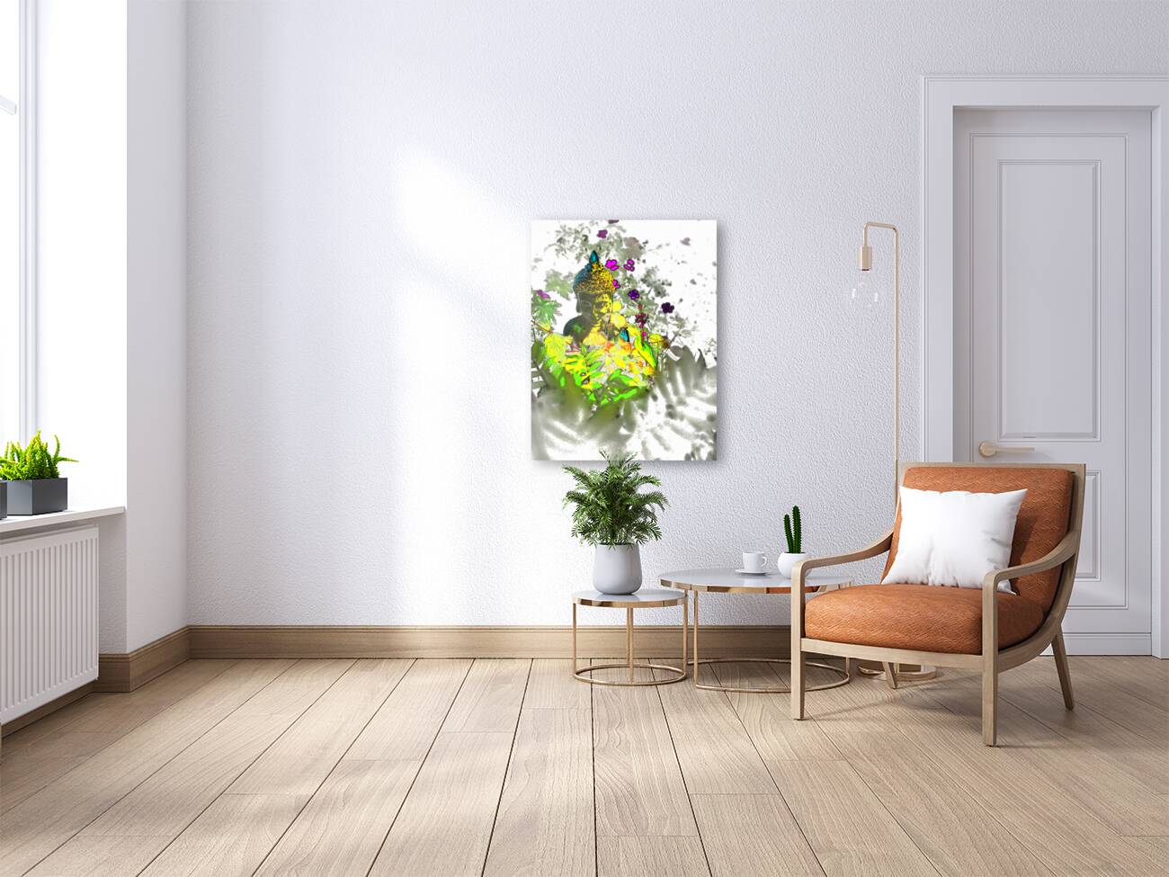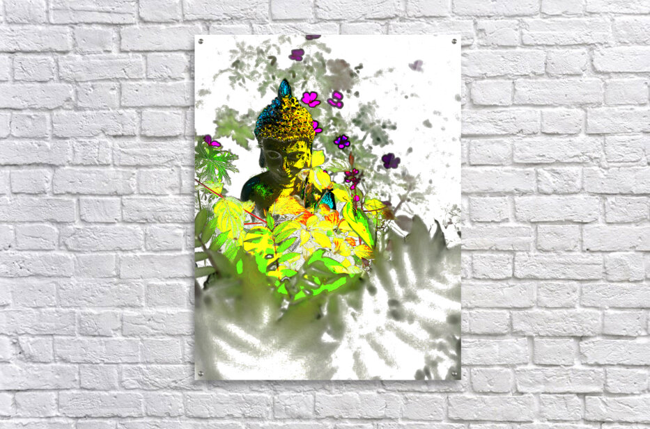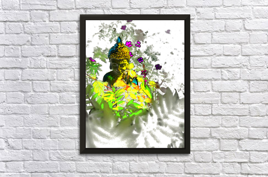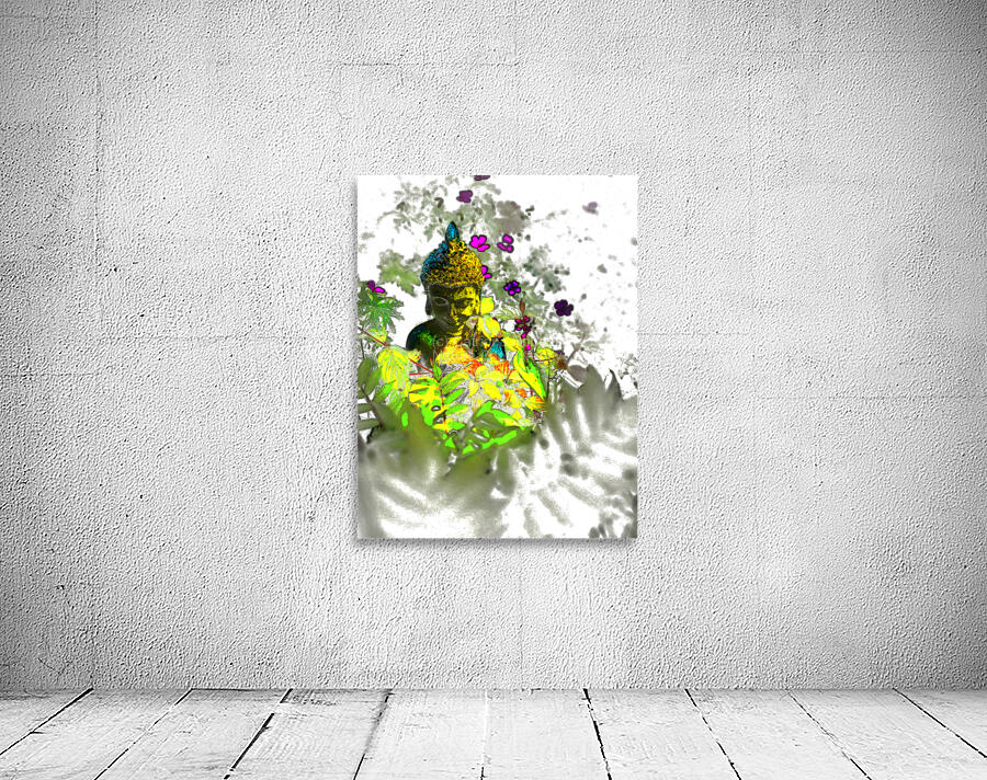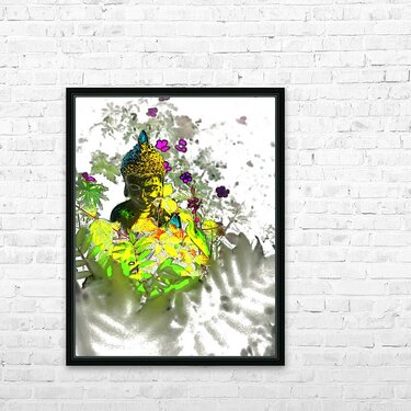 Originally a coloured photograph laterally digitally manipulated into a stunning nature design. Features a serene Buddha statue surrounded by lush greenery and vibrant flowers, creating a peaceful and tranquil scene. The use of bright colors and minimalistic background highlights the calm and meditative atmosphere.