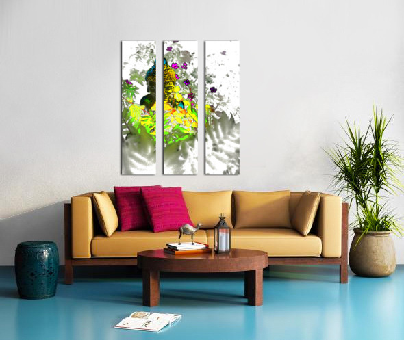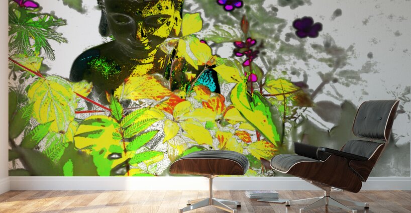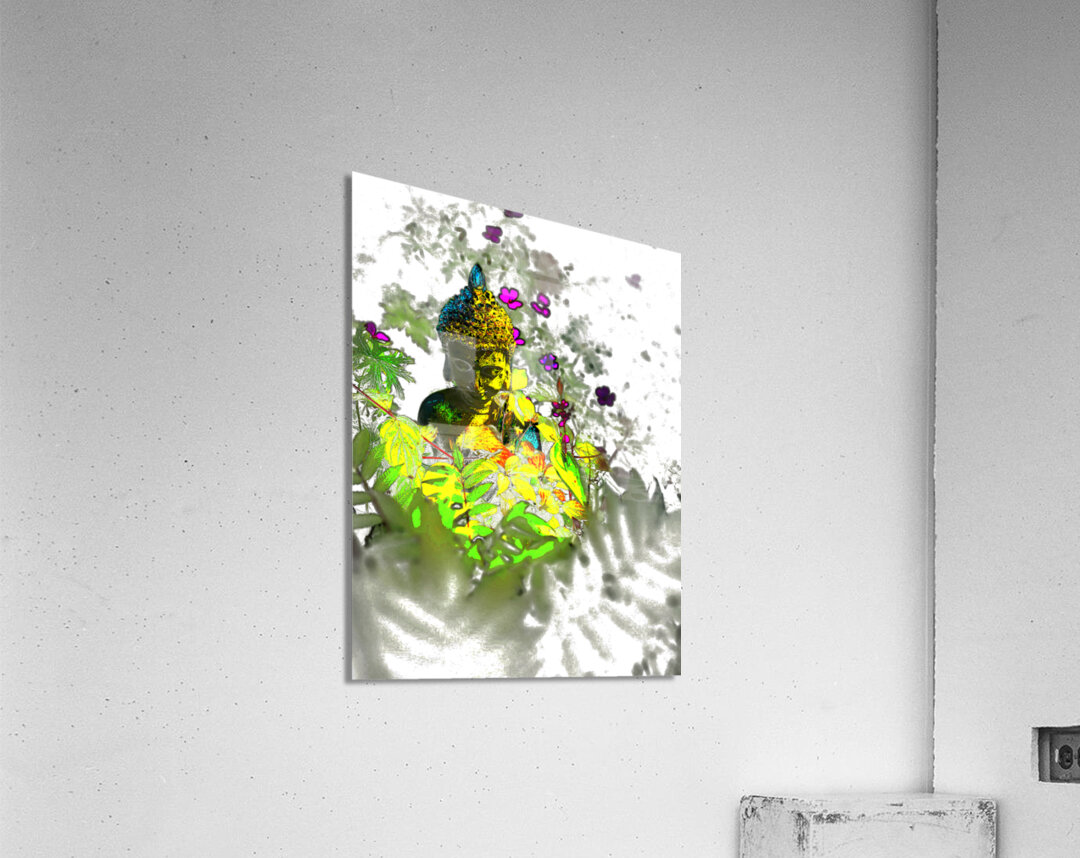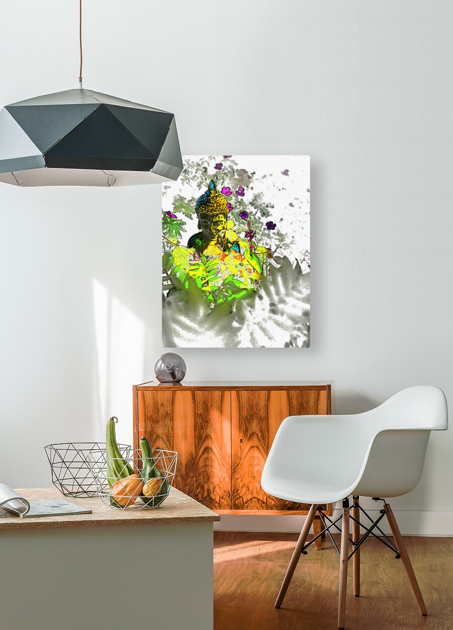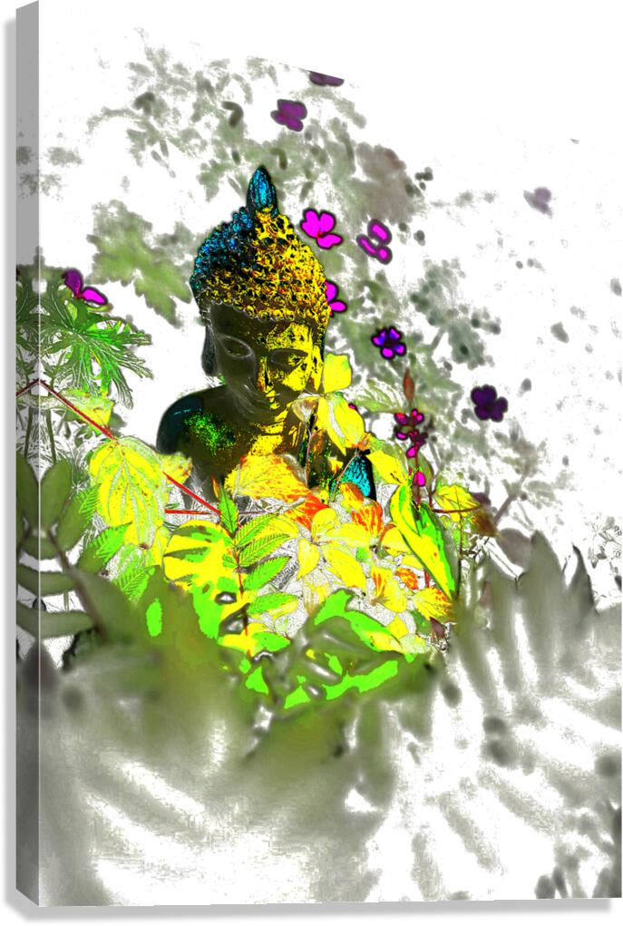 Originally a coloured photograph laterally digitally manipulated into a stunning nature design. Features a serene Buddha statue surrounded by lush greenery and vibrant flowers, creating a peaceful and tranquil scene. The use of bright colors and minimalistic background highlights the calm and meditative atmosphere.