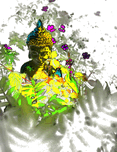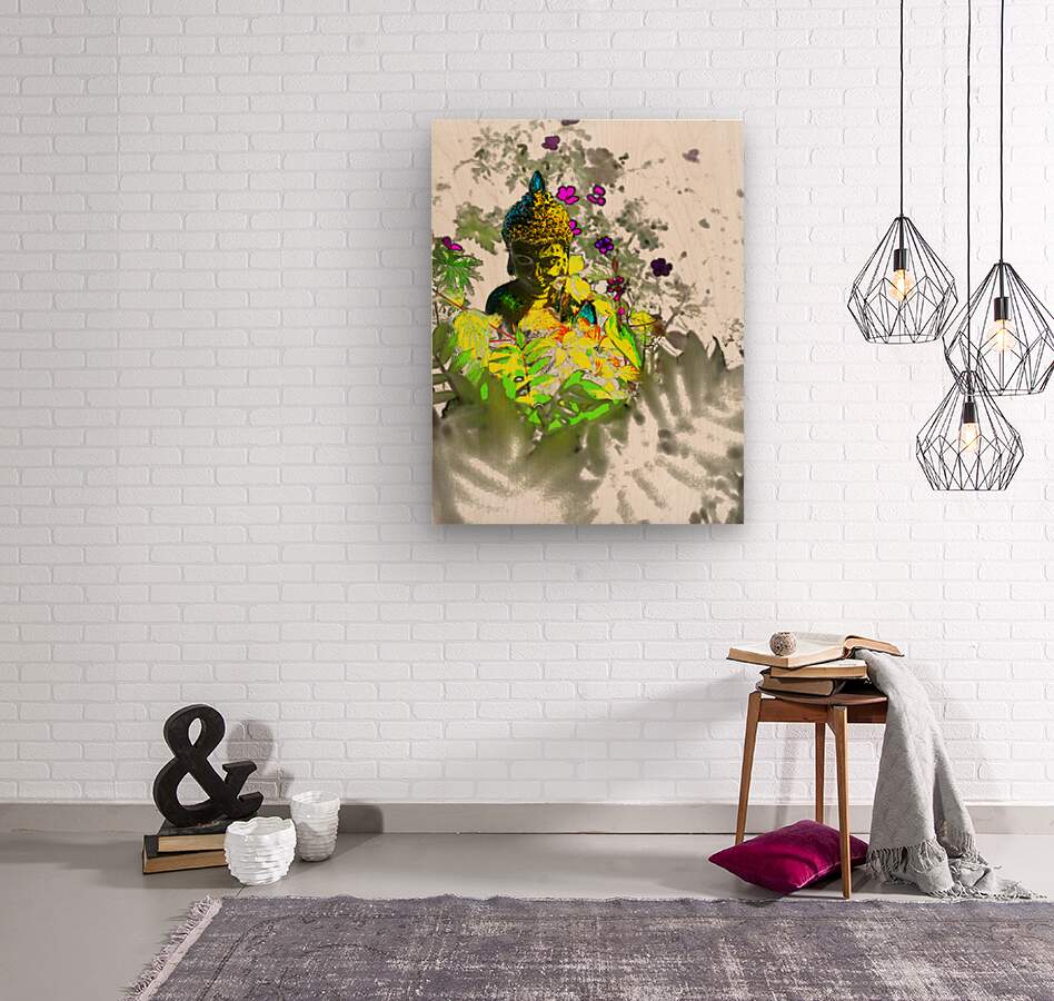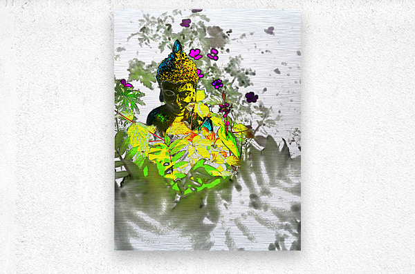 Originally a coloured photograph laterally digitally manipulated into a stunning nature design. Features a serene Buddha statue surrounded by lush gre...[+]