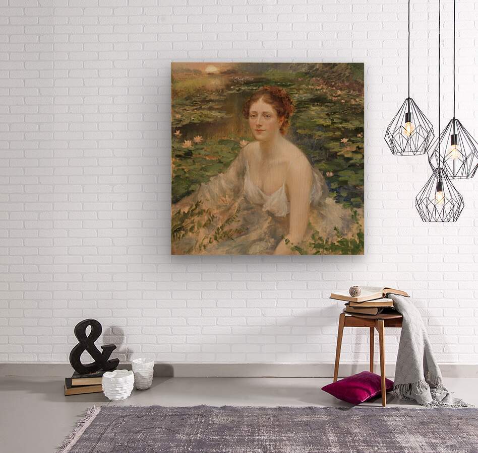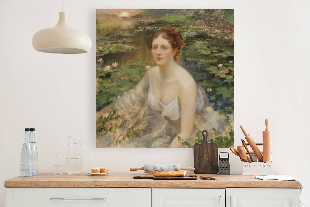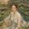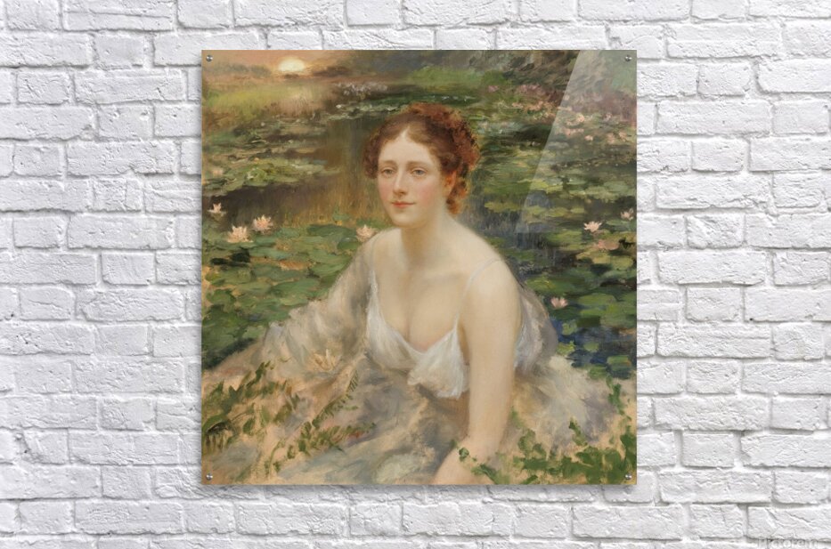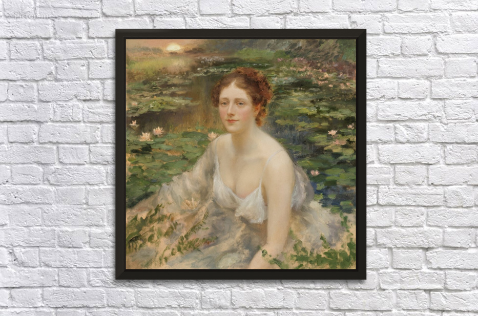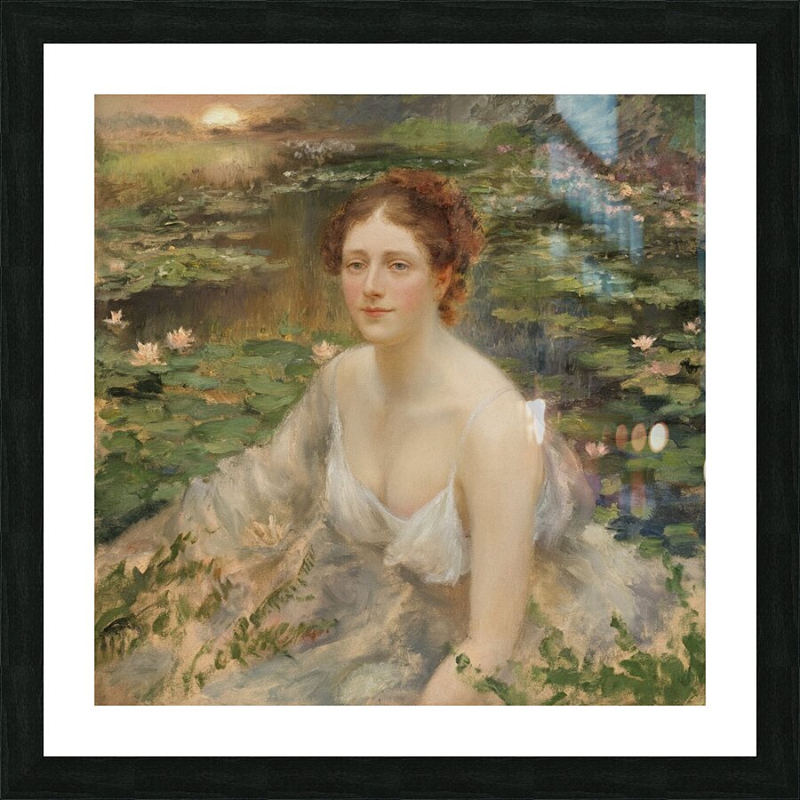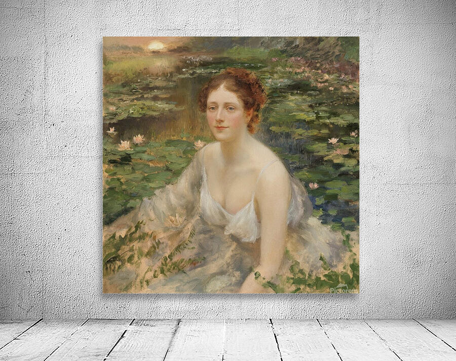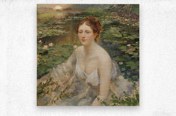 This striking oil painting appears to depict a beautiful young woman sitting in a lush, natural setting. The woman's serene expression and delicate features are highlighted by the luminous, ethereal quality of the painting. The background is filled with a tranquil pond or lake, surrounded by verdant foliage and a golden sunset sky. The overall scene evokes a sense of beauty, peace, and a connection to nature.