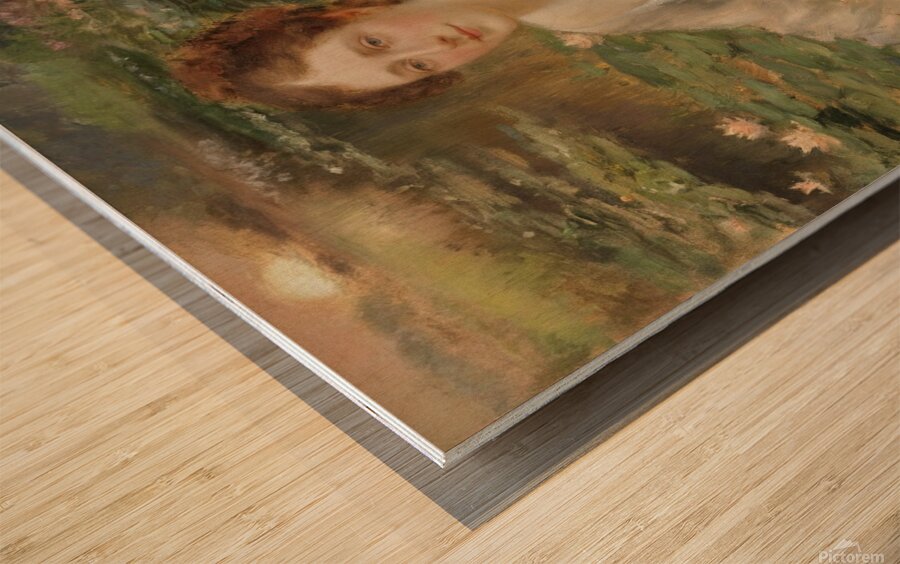 This striking oil painting appears to depict a beautiful young woman sitting in a lush, natural setting. The woman's serene expression and delicat...[+]
