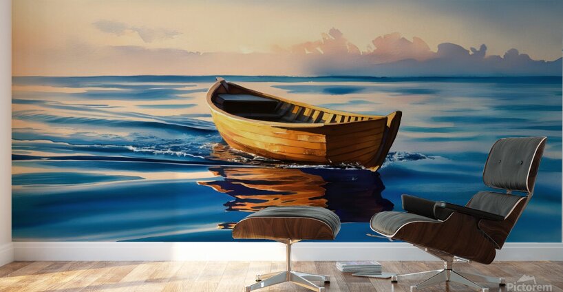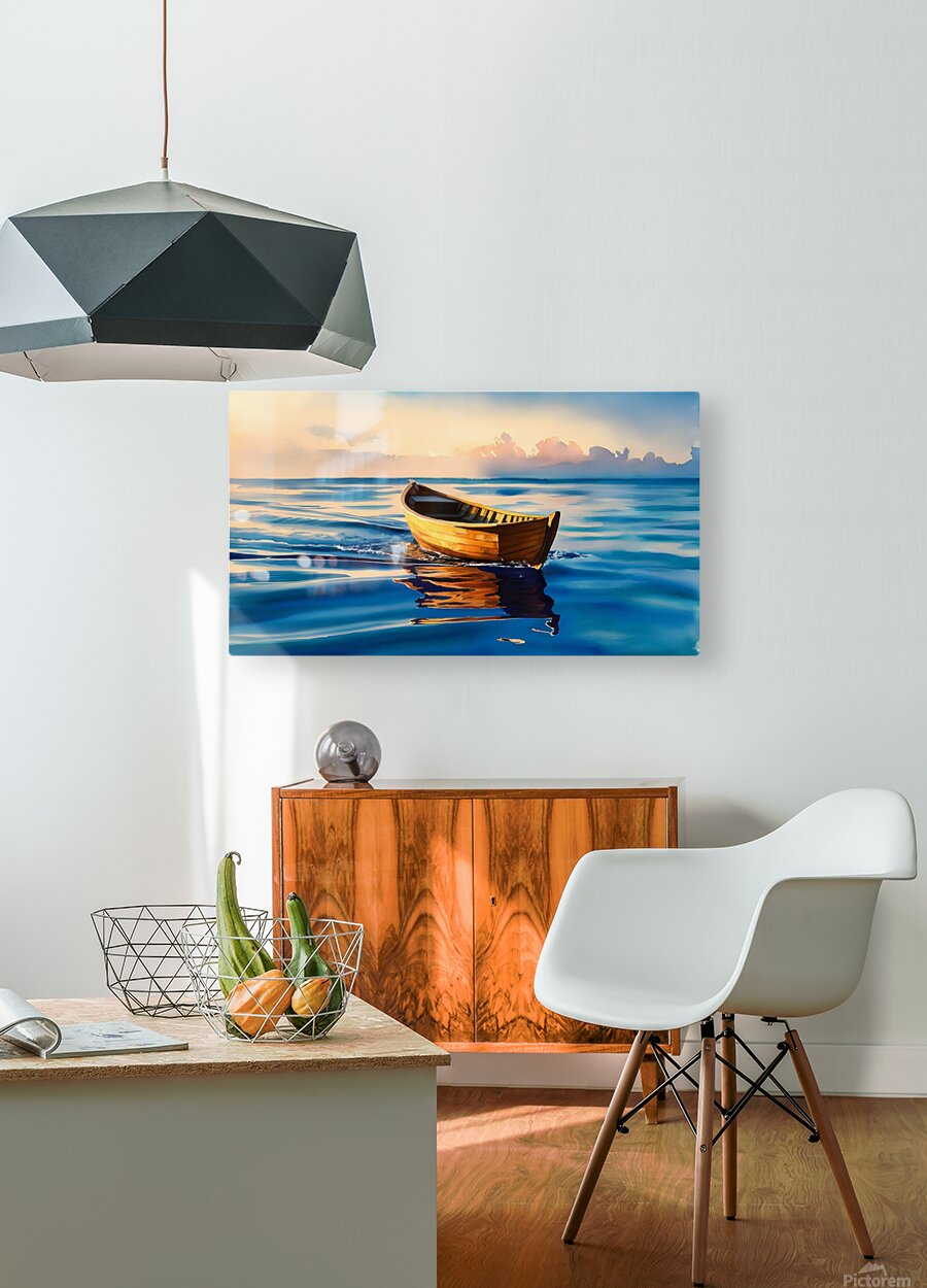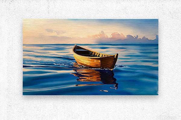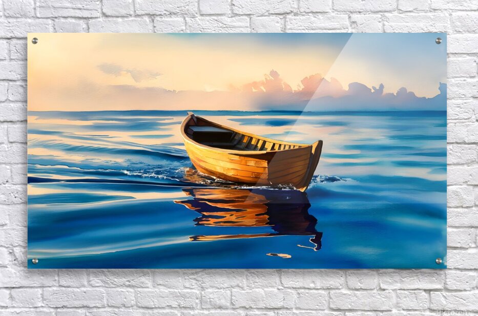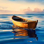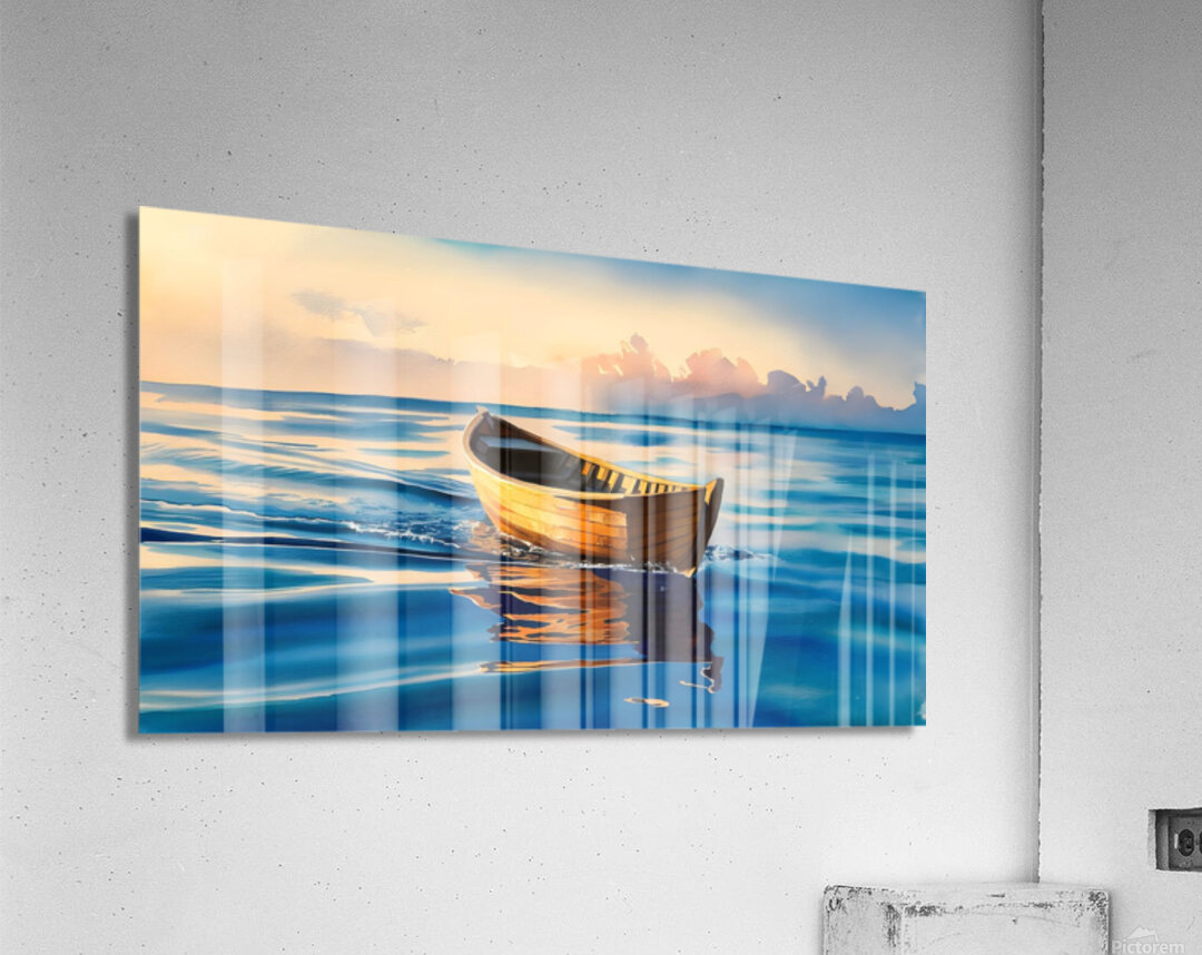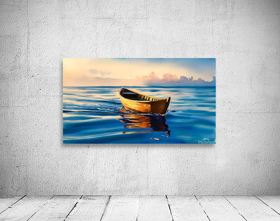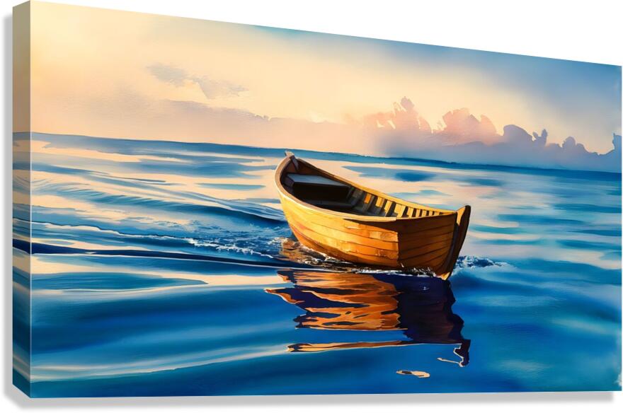Experience the serene beauty of "Tranquil Drift at Sunset," a captivating watercolor painting showcasing a small wooden boat gently floating on calm, blue waters. The warm hues of the sunset cast a golden glow on the boat, creating a mesmerizing reflection on the water's surface. The soft, painterly clouds in the background add a sense of tranquility and depth to the scene, making this artwork a perfect representation of peace and solitude. Ideal for art enthusiasts and nature lovers, this stunning piece will add a touch of serenity to any space.