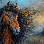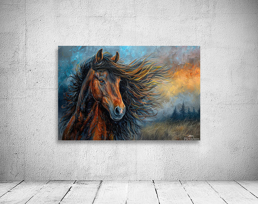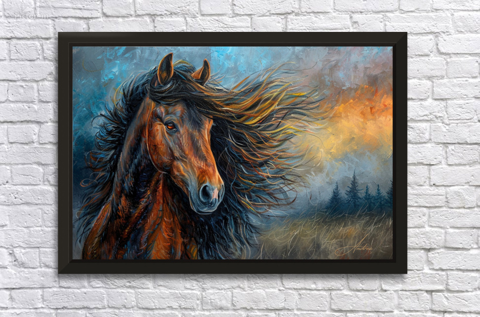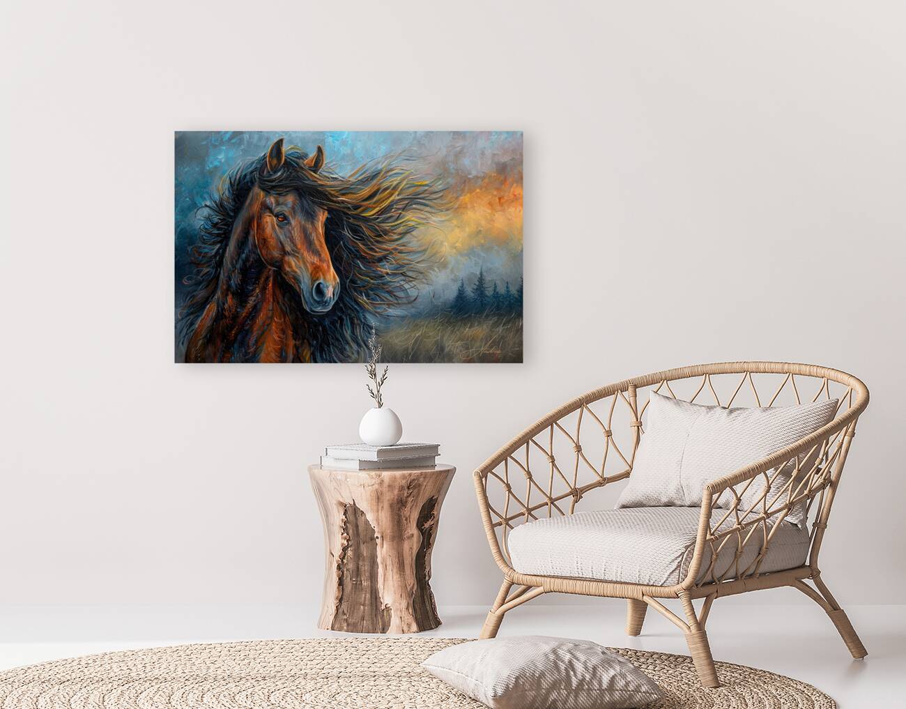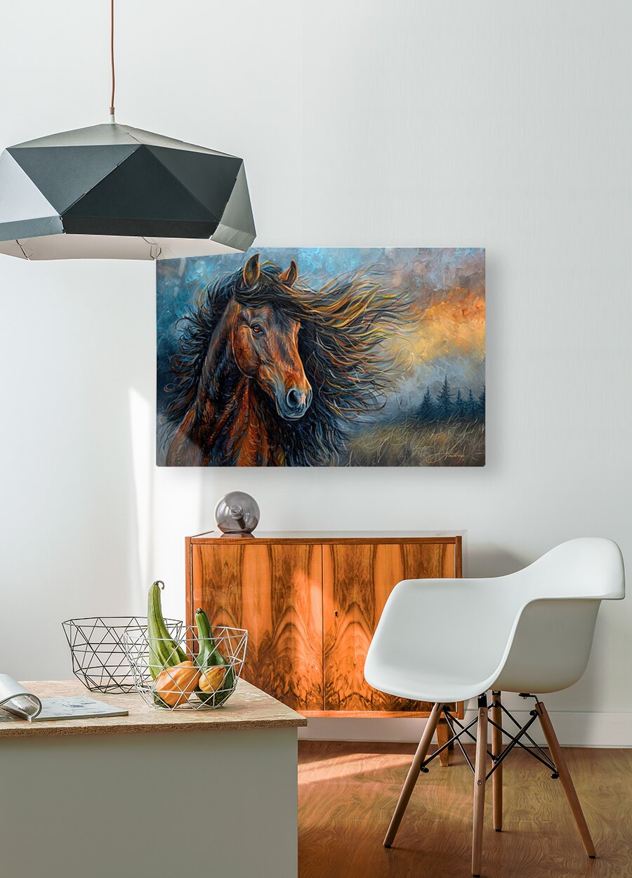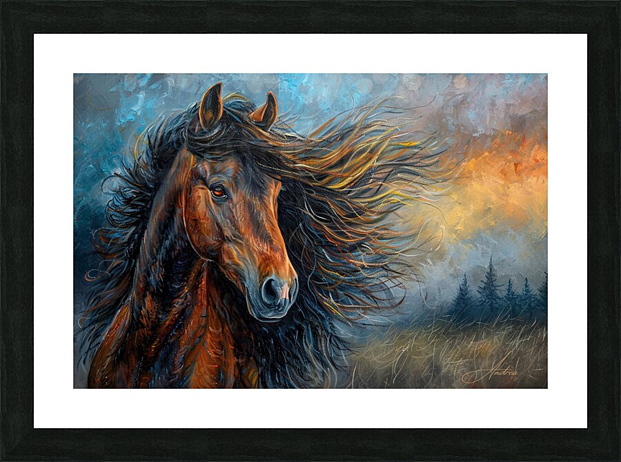 Electrified by the rush of wind on a brisk evening race, Andera Record's Electra Digital-Oil Painting radiates the vibrant light of ions dancing through her being, emanating its full-spectrum charge through her mane and fluffed coat. Our Morgan bay mare is at her happiest when she's galloping, untethered and utterly wild! A lovingly, digitally crafted artwork which you can order in a variety of mediums and sizes. Beautifully printed in Canada by a boutique print house. Order from Stretched canvas, Rolled Canvas, Wood, Brushed Metal, HD Metal, Acrylic, Rolled Satin Paper and Rolled Matte Art Paper. Please contact Andrea for larger sizes.