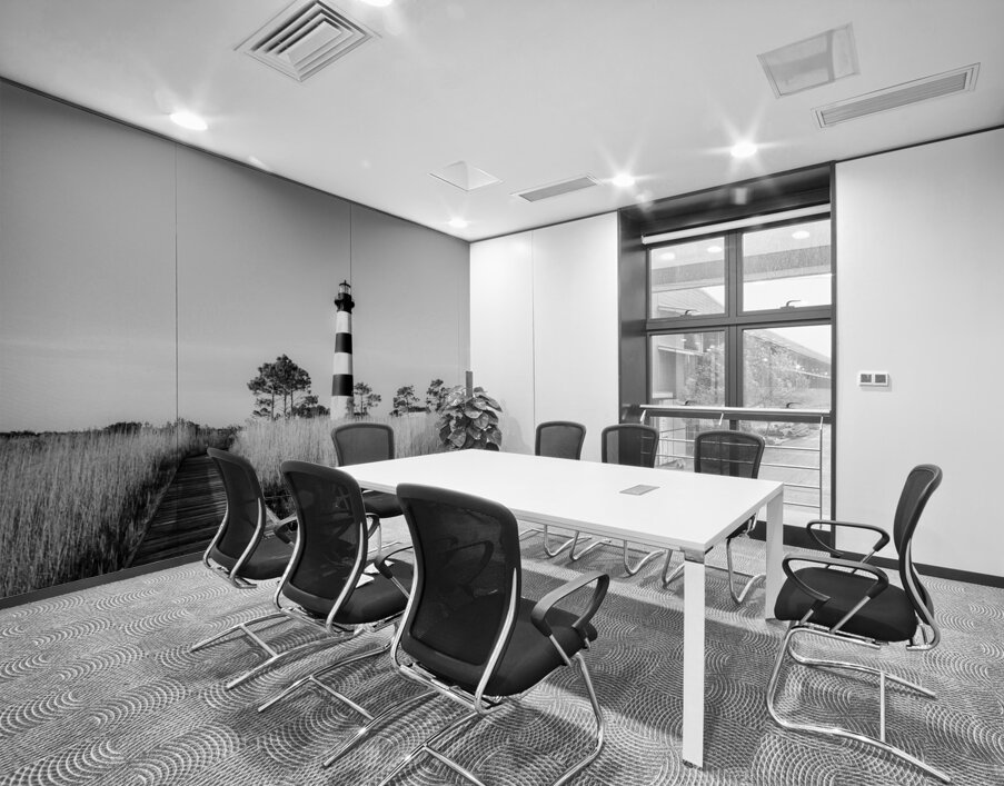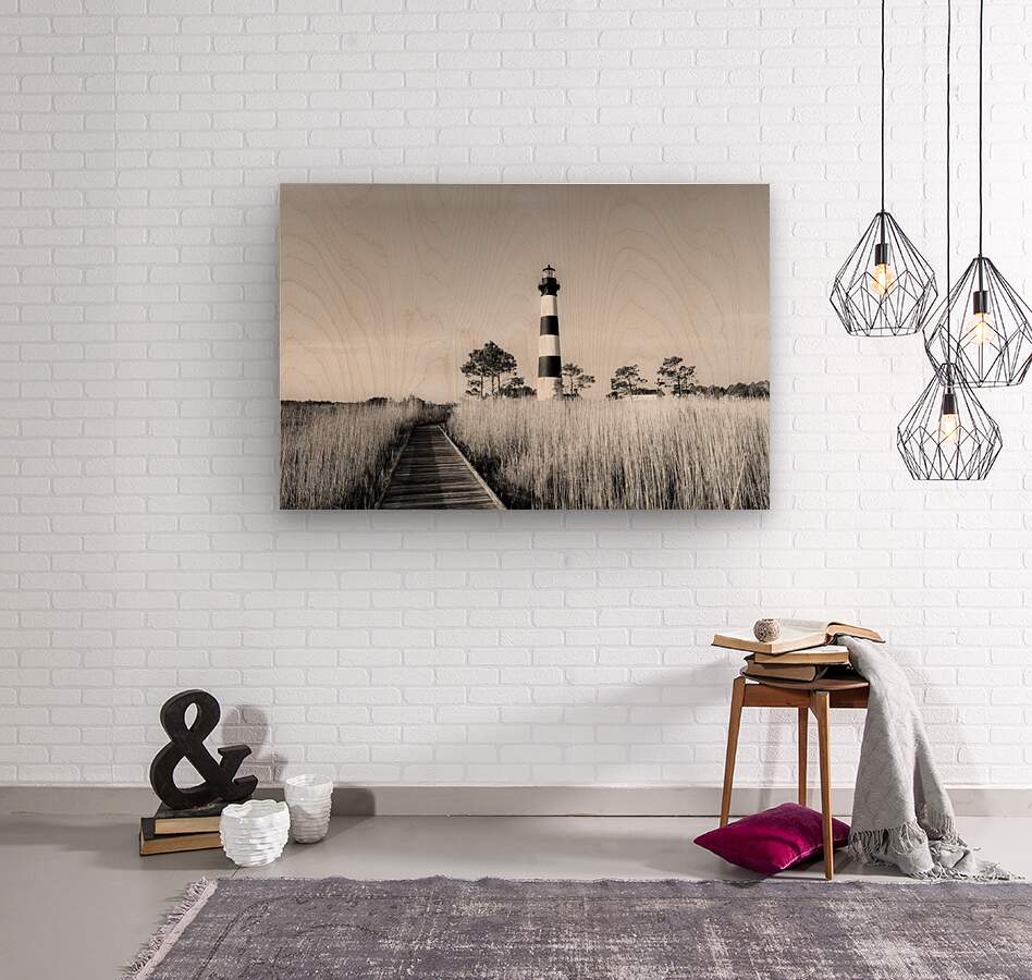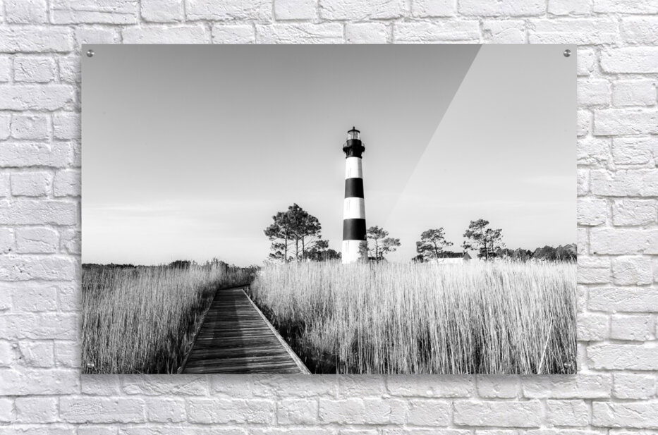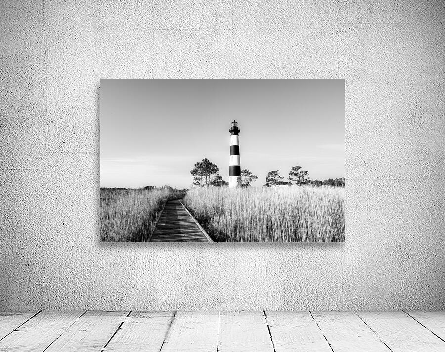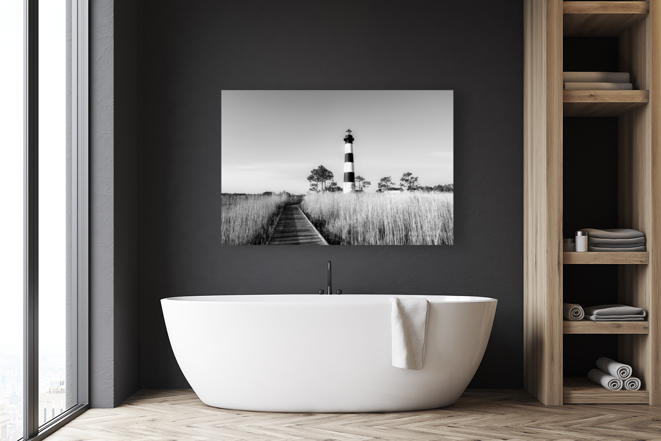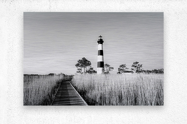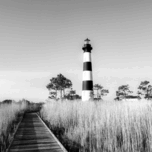 Standing 156-feet tall, the current Bodie Island Lighthouse is actually the third lighthouse along this stretch of the Outer Banks to warn and guide ships. The Bodie Island Lighthouse has a distinctive daymark pattern of horizontal, alternating black and white stripes. Edited in black and white, a boardwalk leading your eyes toward the stark image of this outer banks relic, with an almost abstract feel.