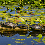 What's better than a half dozen turtles playing musical chairs lining up on a swamp log. Near the Outer Banks (OBX) North Carolina, to catching a few rays of the summer sun with beautiful lotus lillies in the background. What could be better than this turtle spa? Lily Flowers are just getting ready to bloom, adding more charming character to this colorful scenery.