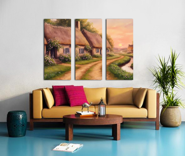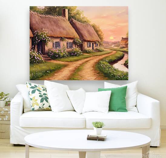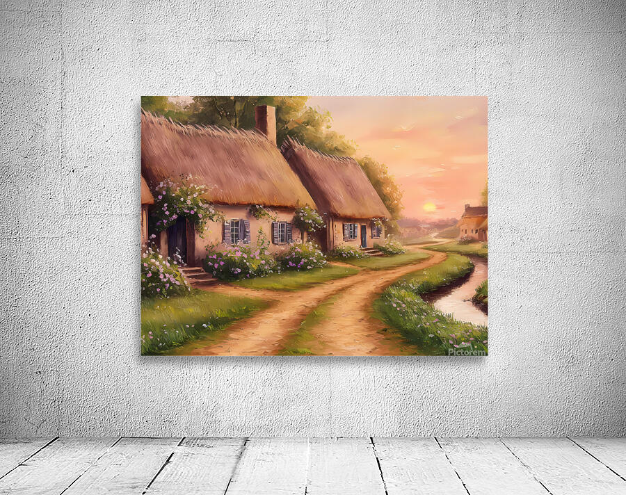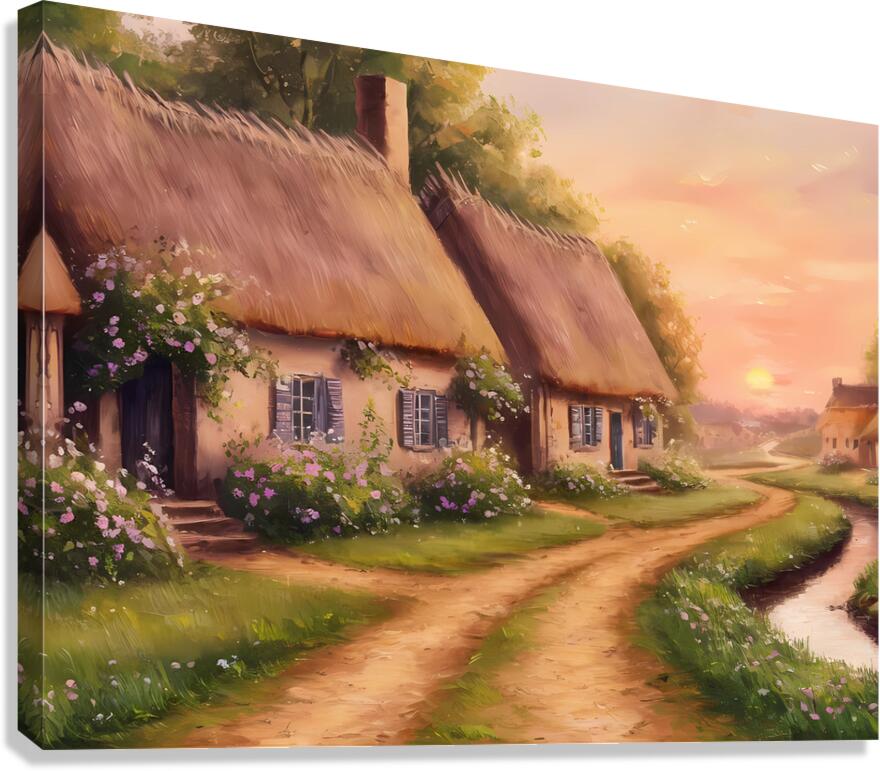 This enchanting oil painting depicts an old house with a thatched roof, exuding rustic charm. Hanging flowers adorn the windows, adding a touch of color and life to the scene. The house sits alongside an unpaved road, which runs next to a flowing stream. The combination of the quaint house, vibrant flowers, and natural elements creates a nostalgic and serene atmosphere. old house, thatched roof, hanging flowers, unpaved road, flowing stream, oil painting, rustic charm, serene, nostalgic, natural elements.