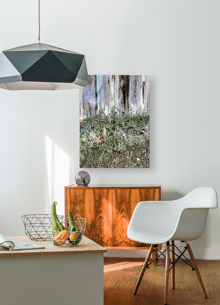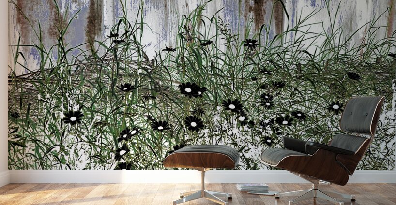 Originally a coloured photo laterally digitally manipulated. Features wild Daisy flowers and tall grass growing against a weathered wooden fence. The flowers are scattered among the greenery, creating a contrast with the aged wood background.