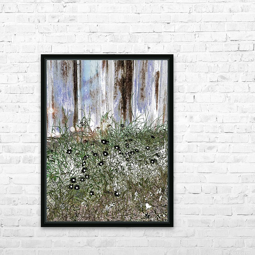 Originally a coloured photo laterally digitally manipulated. Features wild Daisy flowers and tall grass growing against a weathered wooden fence. The ...[+]