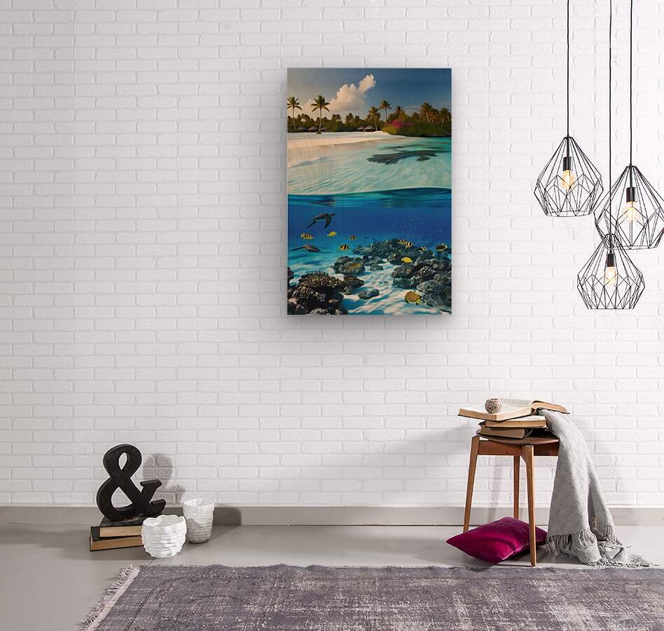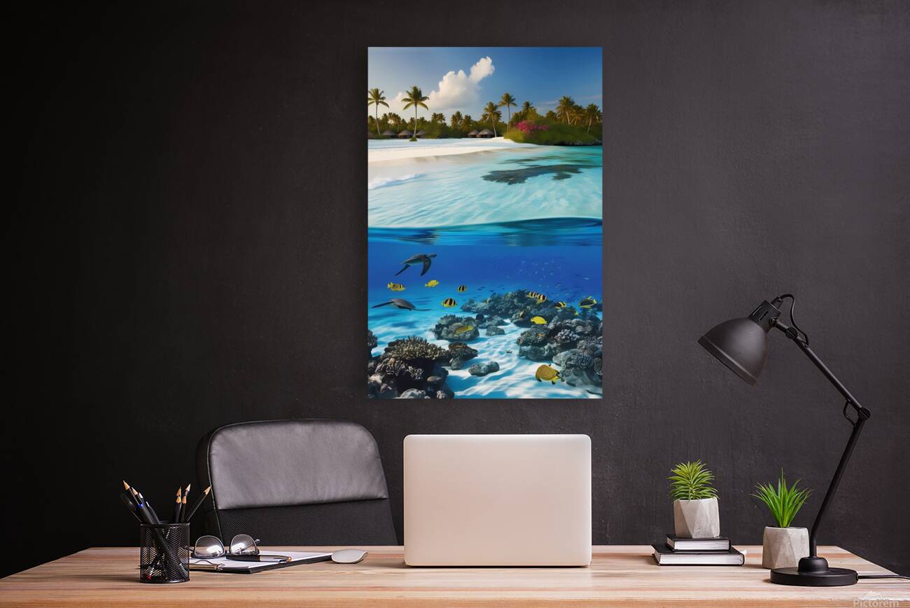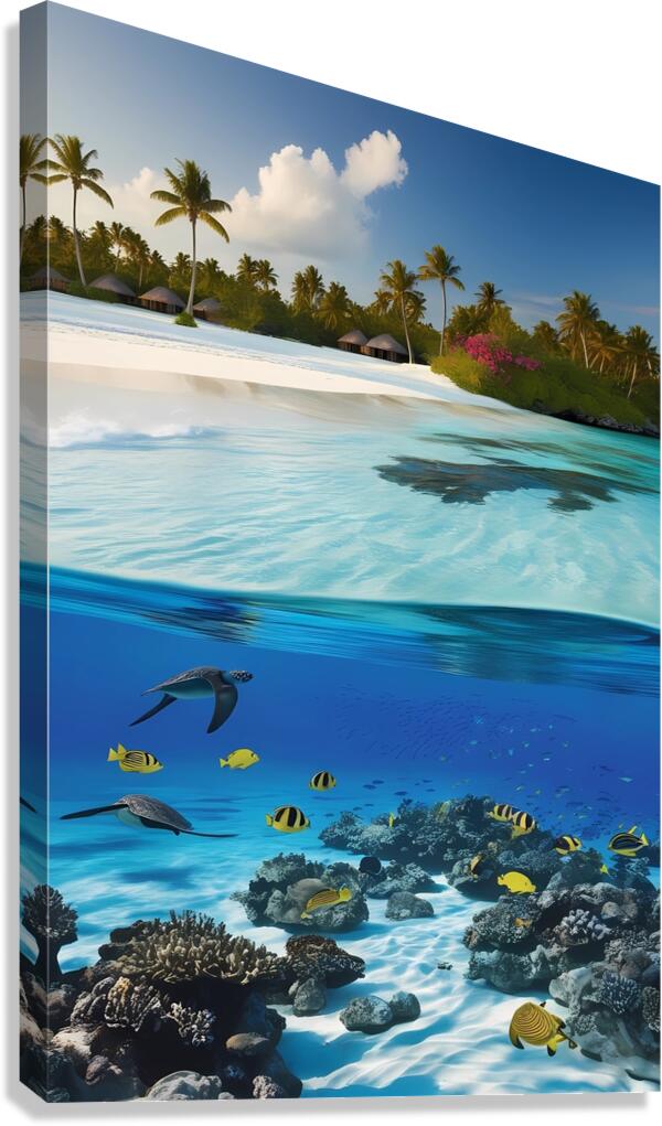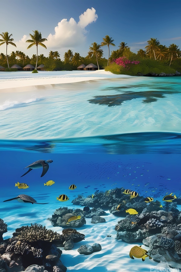 Imagine stepping onto a secluded island in the Maldives, where powdery white sands meet the gentle lapping of crystal-clear turquoise waters. The sun bathes the tropical landscape in a warm glow, highlighting the vibrant colors of lush palm trees and blooming tropical flowers. Under the surface of the calm sea lies a hidden world of dazzling coral reefs, teeming with an array of marine life, from playful schools of fish to graceful manta rays and majestic sea turtles. The air is filled with the soothing sounds of waves and the occasional call of exotic birds, creating a symphony of tranquility. As you explore this paradise, you discover luxurious overwater bungalows that offer uninterrupted views of the horizon, where the sky meets the ocean in a breathtaking display of blues. The evenings bring spectacular sunsets, painting the sky with hues of orange, pink, and purple, as you relax with your feet in the sand, feeling the day's warmth lingering in the air. The Maldives invites you to immerse yourself in its natural beauty, to explore its vibrant underwater gardens, and to experience a sense of peace and wonder that can only be found in this idyllic archipelago.