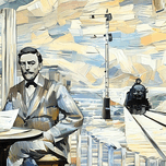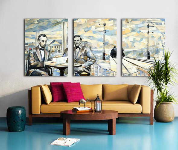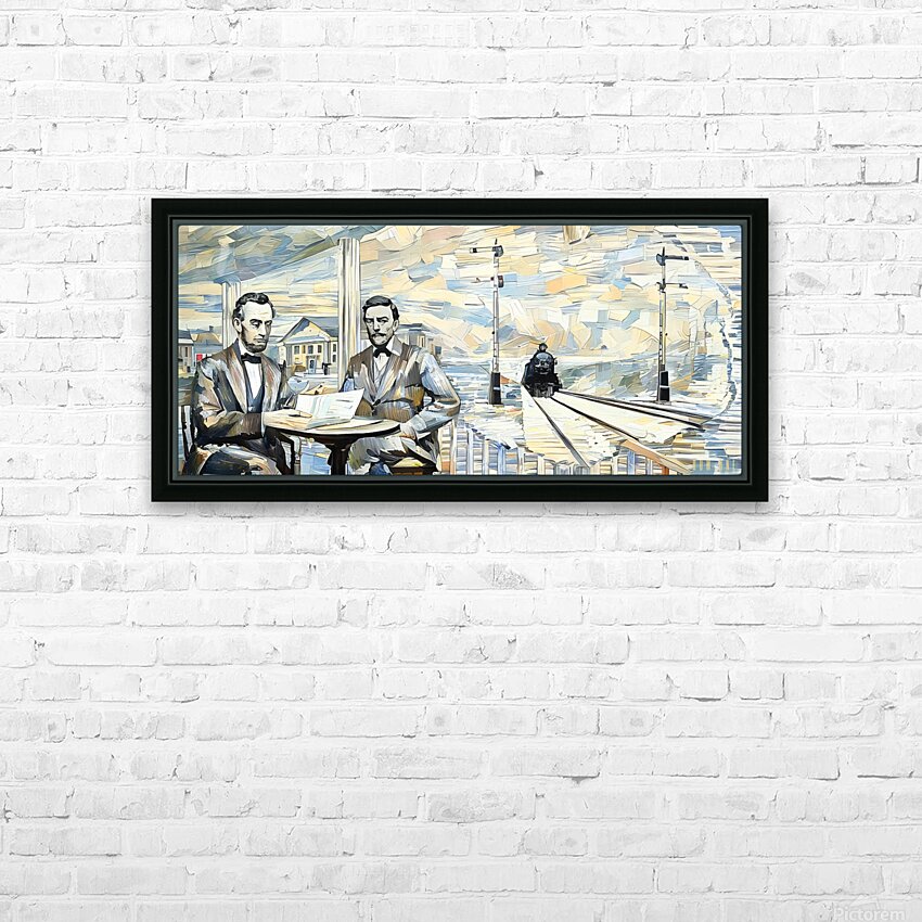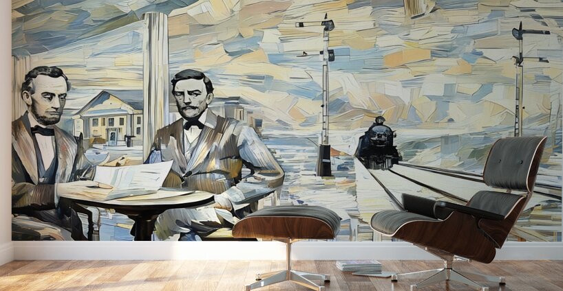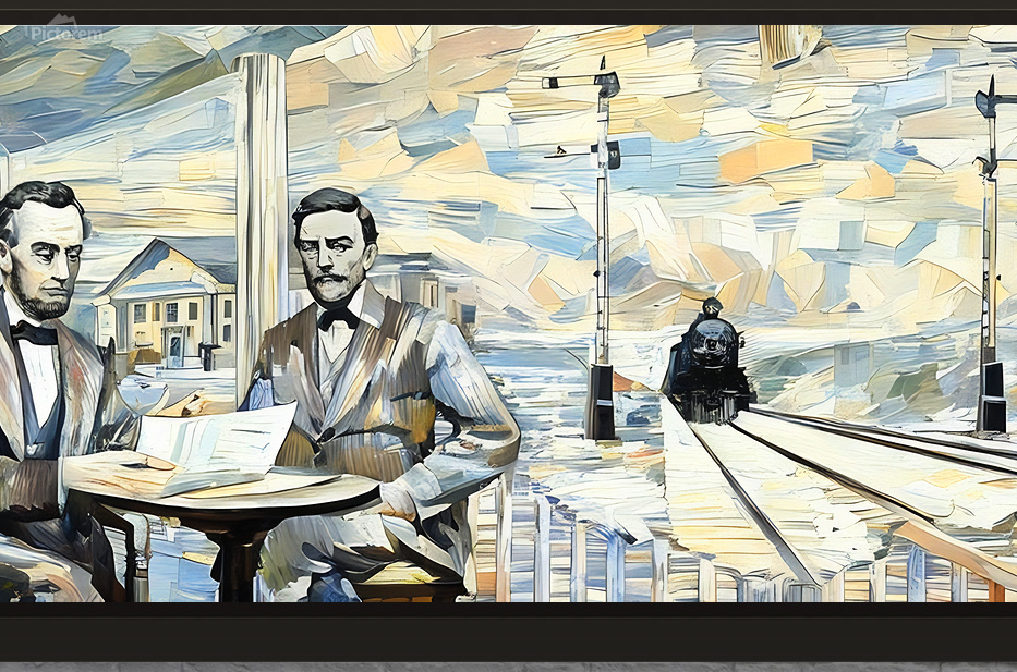 Abe Lincoln and General Dodge in 1859 (1917 Art Remix) | Row One | This art was created from authentic 1917 artwork showing Lincoln and Dodge discussing facts which led to Lincoln building the Union Pacific Railroad. This beautiful art is a true piece of American history. Derivative art © 2024 Row One Brand