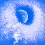 A crescent moon is visible against a deep blue sky, surrounded by a cluster of bright, white speckles that mimic stars or snow. It evokes a dreamy, celestial atmosphere that suggests the quiet calm of a night sky.