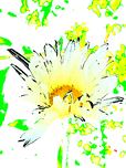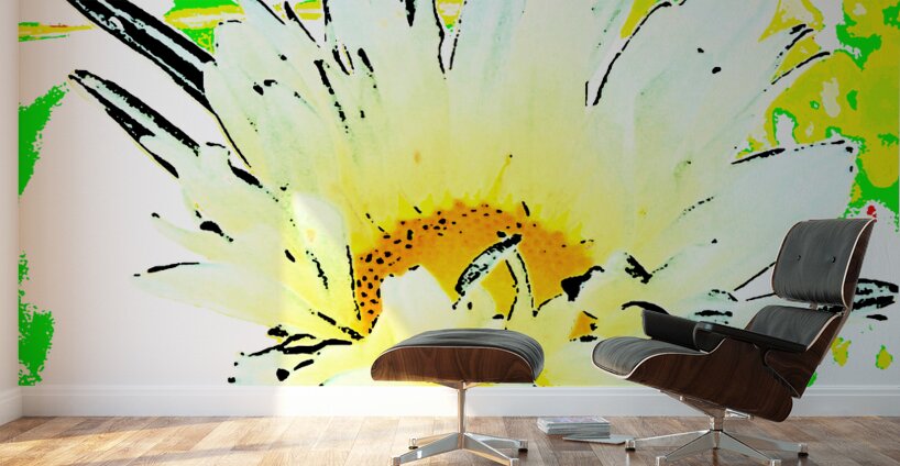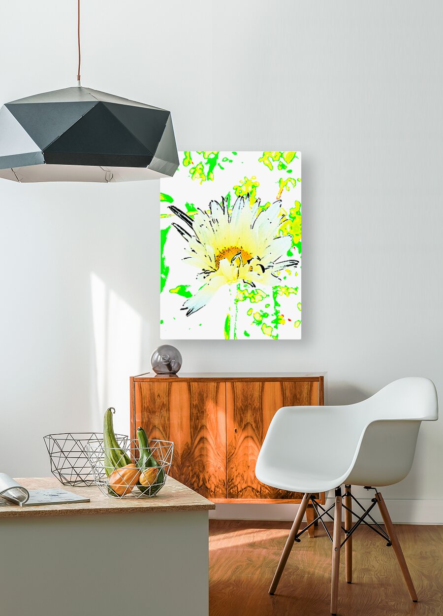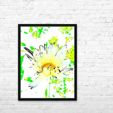 Originally a close up photo of a Daisy flower laterally digitally manipulated into a stunning piece of contemporary floral art. Features a single Daisy flower with white petals and a yellow center standing out against a vibrant, abstract background of green and yellow shapes. The image presents a high-contrast and stylized depiction of natural elements.