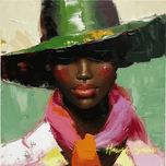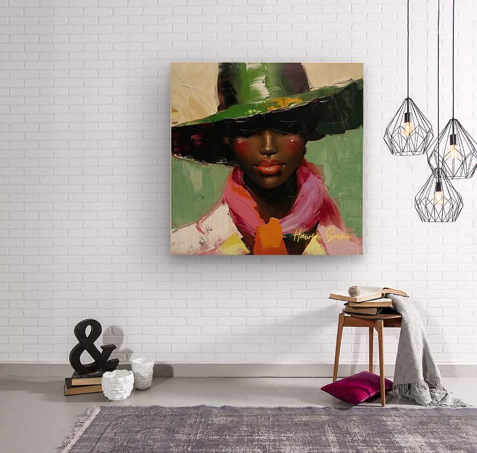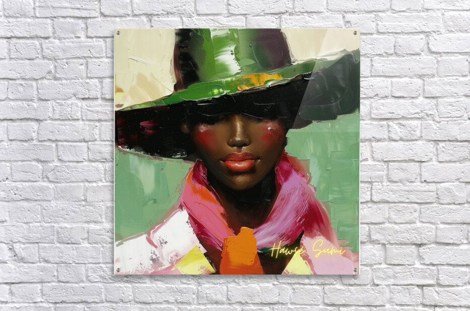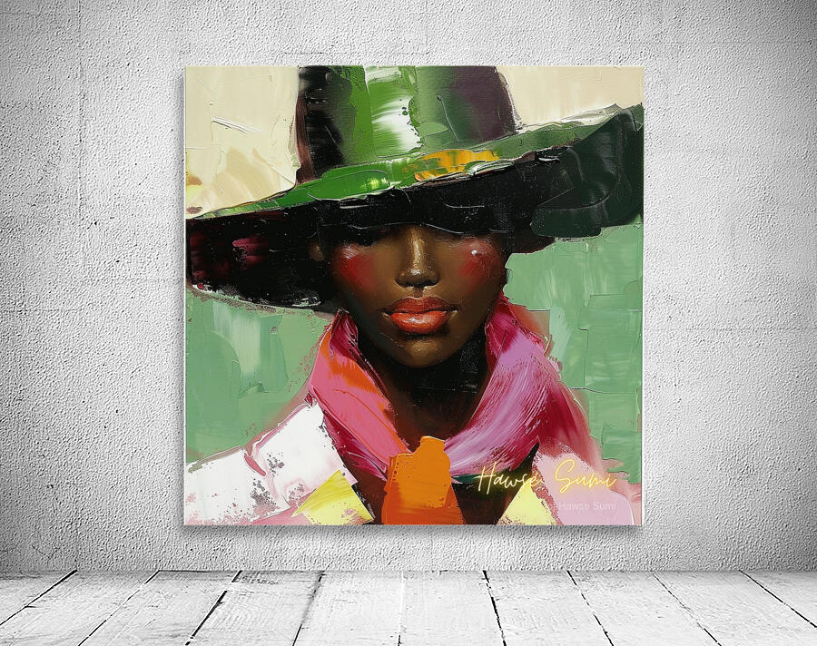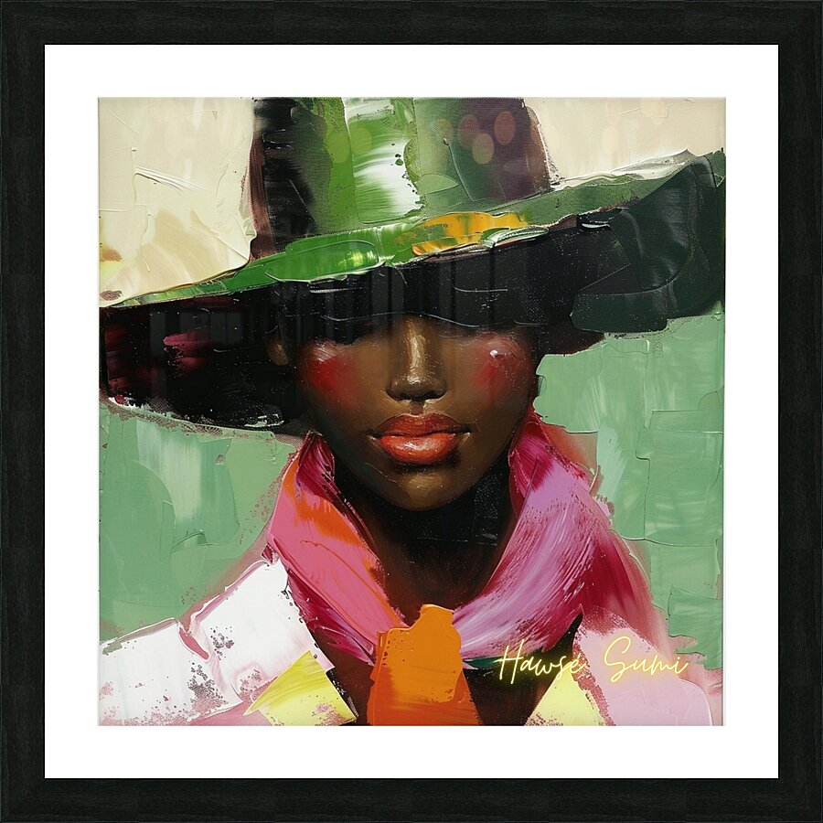 This artwork captures the timeless beauty of a woman adorned in a stylish hat and a striking pink scarf. The rich, contrasting colors and her serene expression reflect an ageless grace and a deep sense of self.